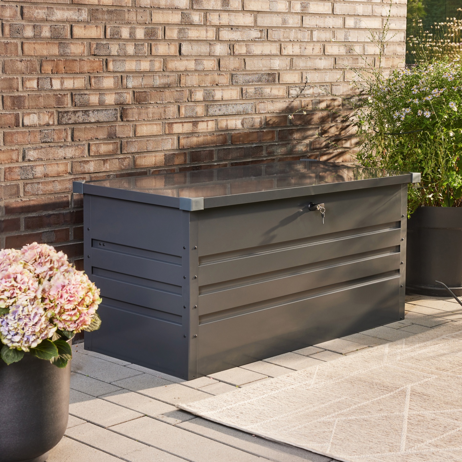 In dieser Box findet alles seinen Platz. Das verzinkte Stahlblech macht die Box besonders langlebig, praktisch wartungsfrei und bietet hervorragenden Schutz gegen Korrosion. Eine ausreichende Belüftung im Inneren ist gegeben, dadurch kann kein lästiger Schimmel entstehen. Der Deckel ist mit 2 Gasdruckzylindern ausgestattet und lässt sich daher mühelos öffnen. Für zusätzliche Sicherheit lässt sich die Aufbewahrungsbox auch abschließen. Kleine Möbelfüße sorgen für Standfestigkeit. Zusätzlich schonst du den Untergrund und schützen die Aufbewahrungsbox vor Feuchtigkeit.