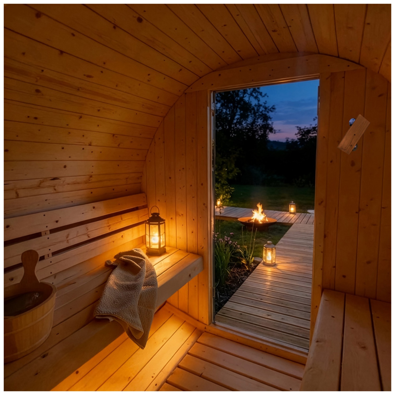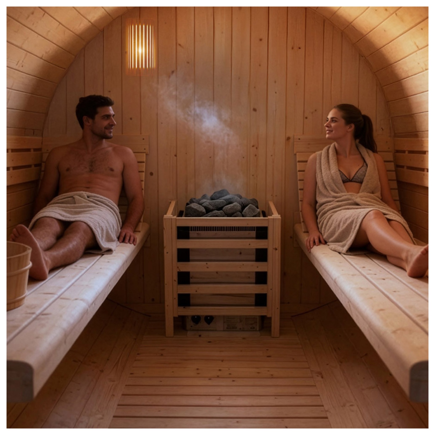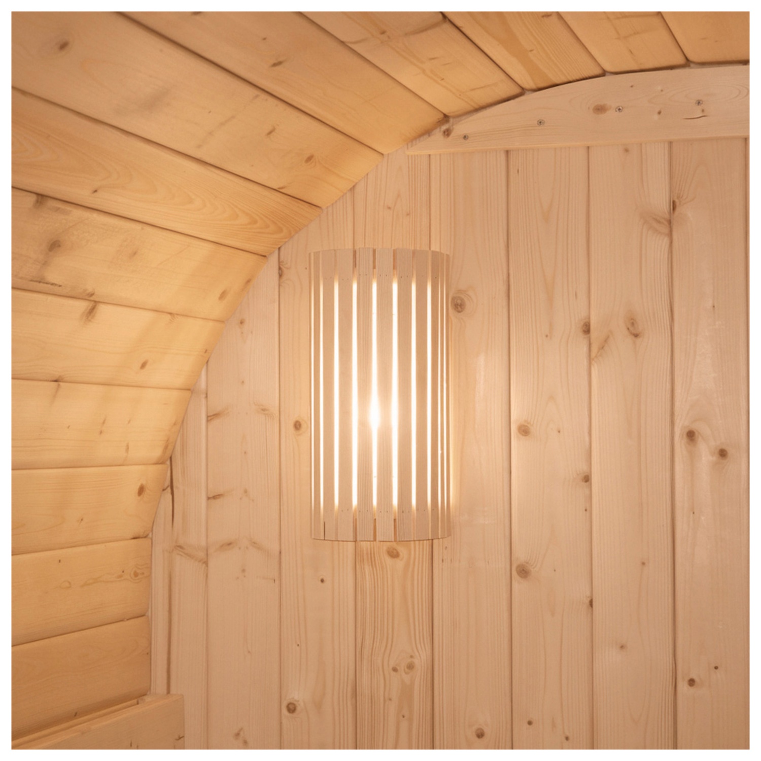 Das Kernstück dieser traditionellen Outdoor-Fasssauna ist der Hochleistungsofen (8 kW). Die Fasssauna fügt sich aufgrund ihrer Maße und Optik harmonisch in jeden Outdoorbereich ein. Das Finnenhaus benötigt wenig Platz und ist deshalb auch für kleine Gärten die optimale Lösung. Die besondere Formgebung bringt nur Vorteile für dich mit. Luft und Wärme können optimal in einer Fasssauna zirkulieren. So sorgt die ungewöhnliche Bauform der Fasssauna also für eine optimale Verteilung von Temperatur und Feuchtigkeit, ein stetiges Raumklima und somit für maximalen und erholsamen Saunagenuss. Im Innenraum befinden sich zwei voll umrahmte Bänke. Eine Saunaleuchte sorgt zudem für angenehme Beleuchtung. Und nicht nur der Saunaofen ist von höchster Qualität, auch für die Wände dieser Sauna haben wir hochwertiges Fichtenholz verwendet. Die durchdachte Verarbeitung dieses nachhaltigen Rohstoffes sorgt nicht nur für eine elegante Optik, sondern auch für hervorragende Funktionalität und Haltbarkeit. Aufgrund seiner natürlichen Beschaffenhet besitzt es eine hervorragende Wärmedämmung und ist somit optimal für den Einsatz im Saunasystem geeignet. Die Wärme wird im Saunainnenraum gehalten, während die Temperatur der Außenschicht der Sauna nahezu auf Außentemperatur bleibt. Durch diese Eigenschaft des natürlichen Rohstoffes kommt es zu keinem merklichen Wärmeverlust und somit zu keinem unnötigen Energieverlust.
