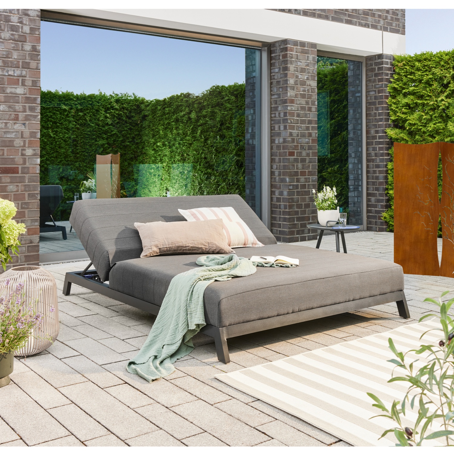 Auf dieser exklusiven Doppelliege kannst du mit einem Buch in der Sonne liegen und nach einem stressigen Arbeitsalltag zur Ruhe kommen. Die Rückenlehne ist je nach Bedarf in 3 verschiedenen Positionen verstellbar und kann sich durch den hohen Liegekomfort deinen Wünschen anpassen. aus der großen Liegefläche kannst du es dir zu zweit gemütlich machen.