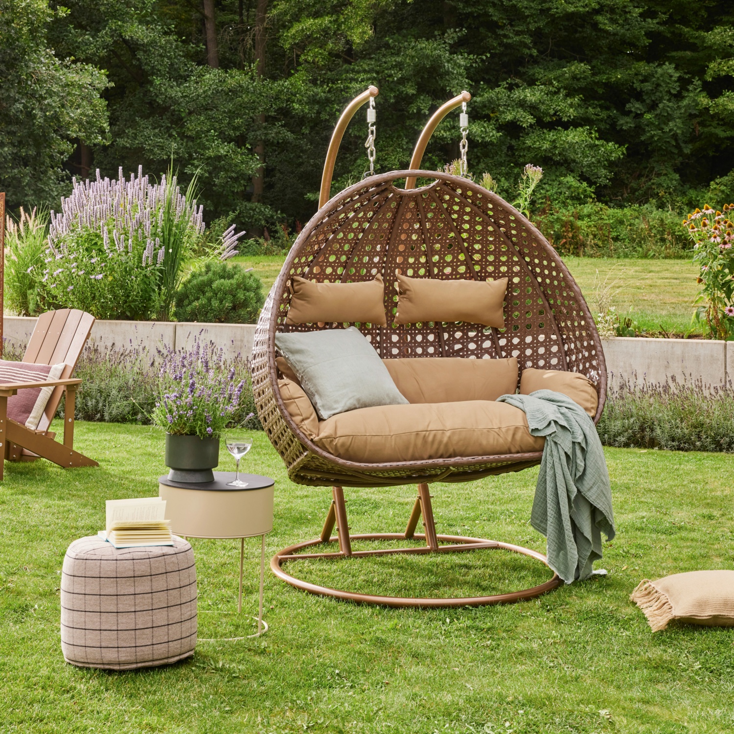 Ob drinnen oder draußen, im TWIN Rattan-Hängesessel sind Sie gut aufgehoben. Nutzen Sie den Platz und machen Sie es sich alleine oder zu zweit gemütlich. Durch die sanften Vibrationen versetzt Sie unser Hängesessel in einen angenehmen Ruhezustand, lassen Sie sich einfach treiben. Der freischwingende Hängesessel ist äußerst langlebig und witterungsbeständig. Elegant geformt und in einem natürlichen Braunton gehalten, passt es in jedes Ambiente. Das Metallgestell istbesonders stabil, während die zwei gefederten Aufhängungen diesen Stuhl noch komfortabler machen. Sobald Sie Platz genommen haben, werden Sie diesen Hängesessel nicht mehr missen wollen.