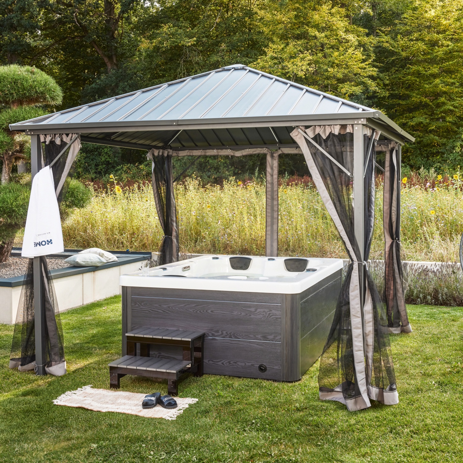 HOME DELUXE White Marble Outdoor Whirlpool inkl. Treppe und Thermoabdeckung