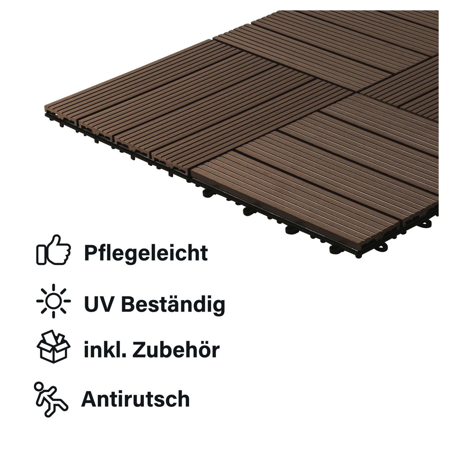 Die leichte Maserung der Oberfläche sorgt für eine überzeugende Holzoptik und machen die umweltfreundlichen Fliesen zu einem echten Highlight in Ihrem Außenbereich. Die Unterseite der Terrassenfliesen ist mit einem Drainagegitter versehen, so dass diese auch nach einem Regenguss schnell trocknen und wieder ohne Rutschgefahr begangen werden können. Das praktische Klicksystem unserer Terrassenfliesen macht das Verlegen auch auf größeren Flächen kinderleicht und schnell. Die Fliesen werden einfach ineinander verhakt, wodurch eine stabile einheitliche Fläche entsteht.
