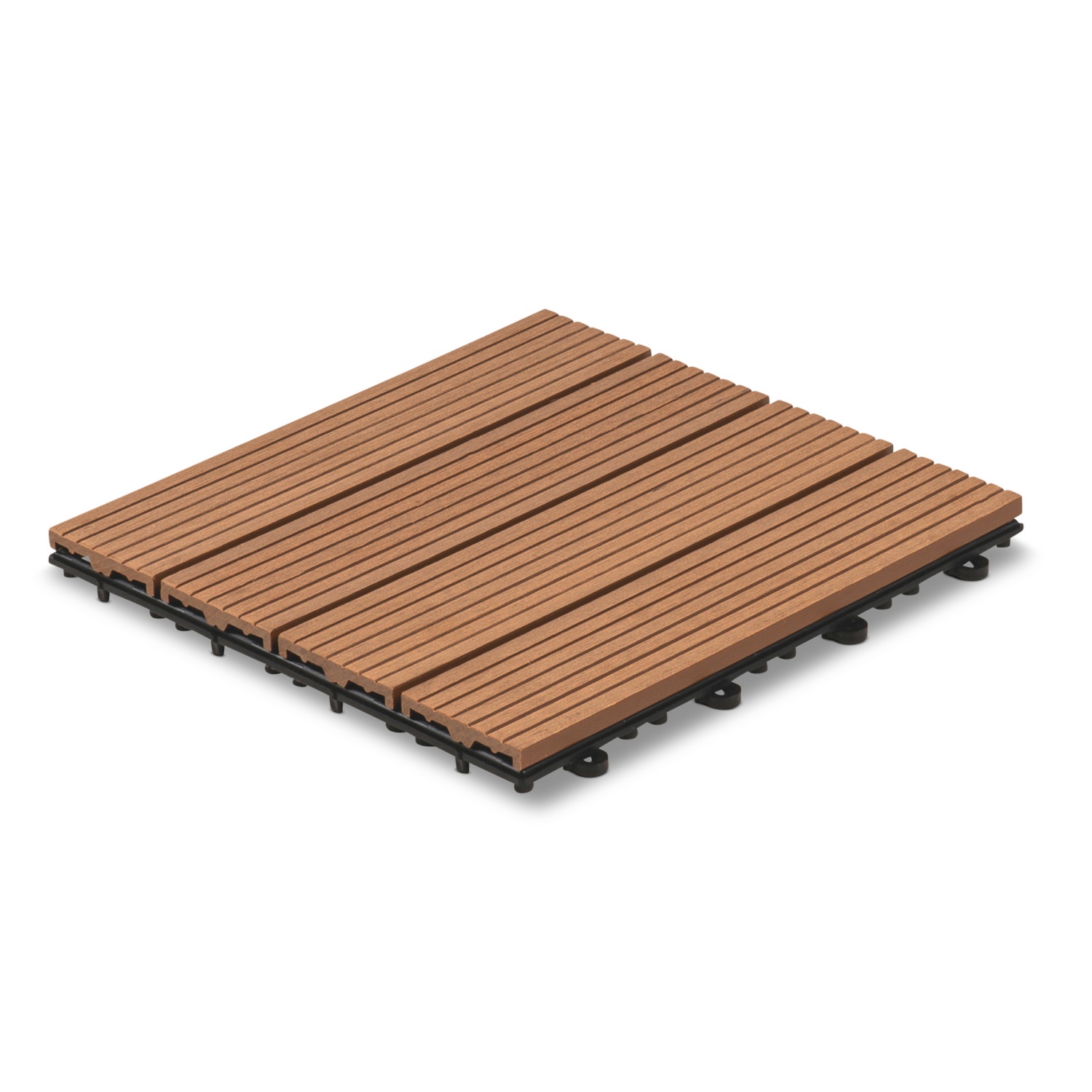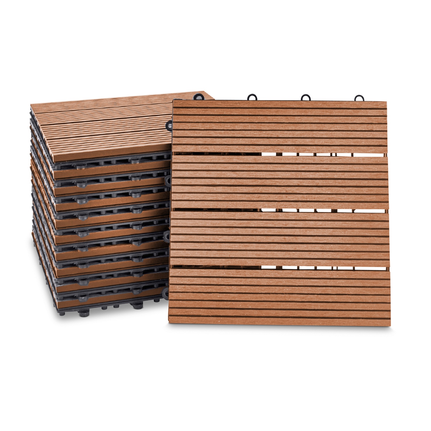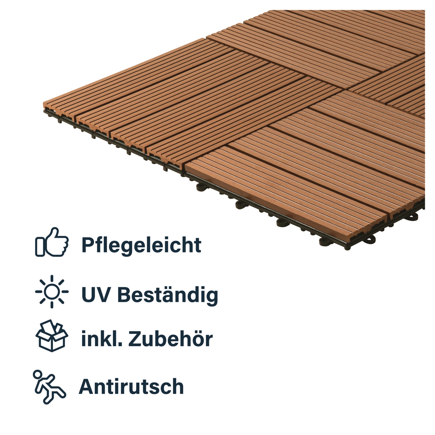 Die leichte Maserung der Oberfläche sorgt für eine überzeugende Holzoptik und machen die umweltfreundlichen Fliesen zu einem echten Highlight in Ihrem Außenbereich. Die Unterseite der Terrassenfliesen ist mit einem Drainagegitter versehen, so dass diese auch nach einem Regenguss schnell trocknen und wieder ohne Rutschgefahr begangen werden können. Das praktische Klicksystem unserer Terrassenfliesen macht das Verlegen auch auf größeren Flächen kinderleicht und schnell. Die Fliesen werden einfach ineinander verhakt, wodurch eine stabile einheitliche Fläche entsteht.