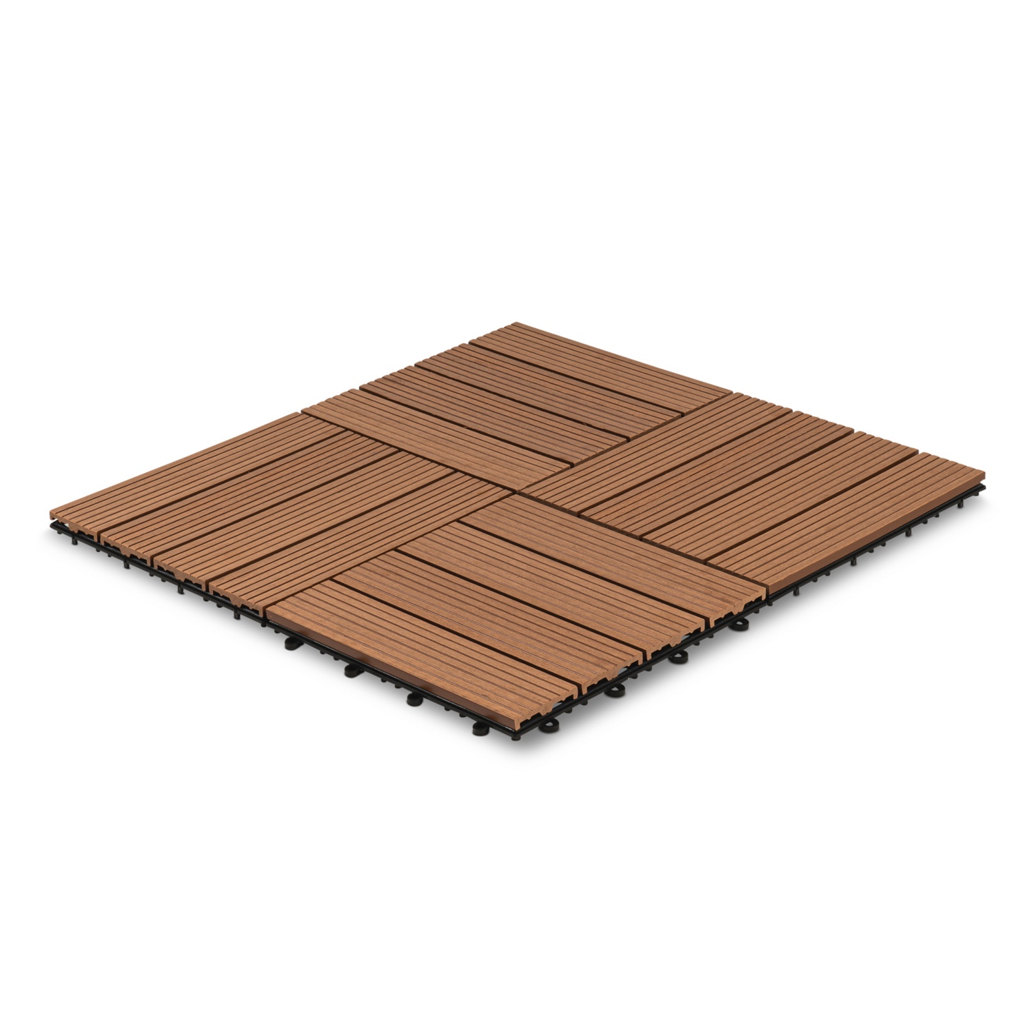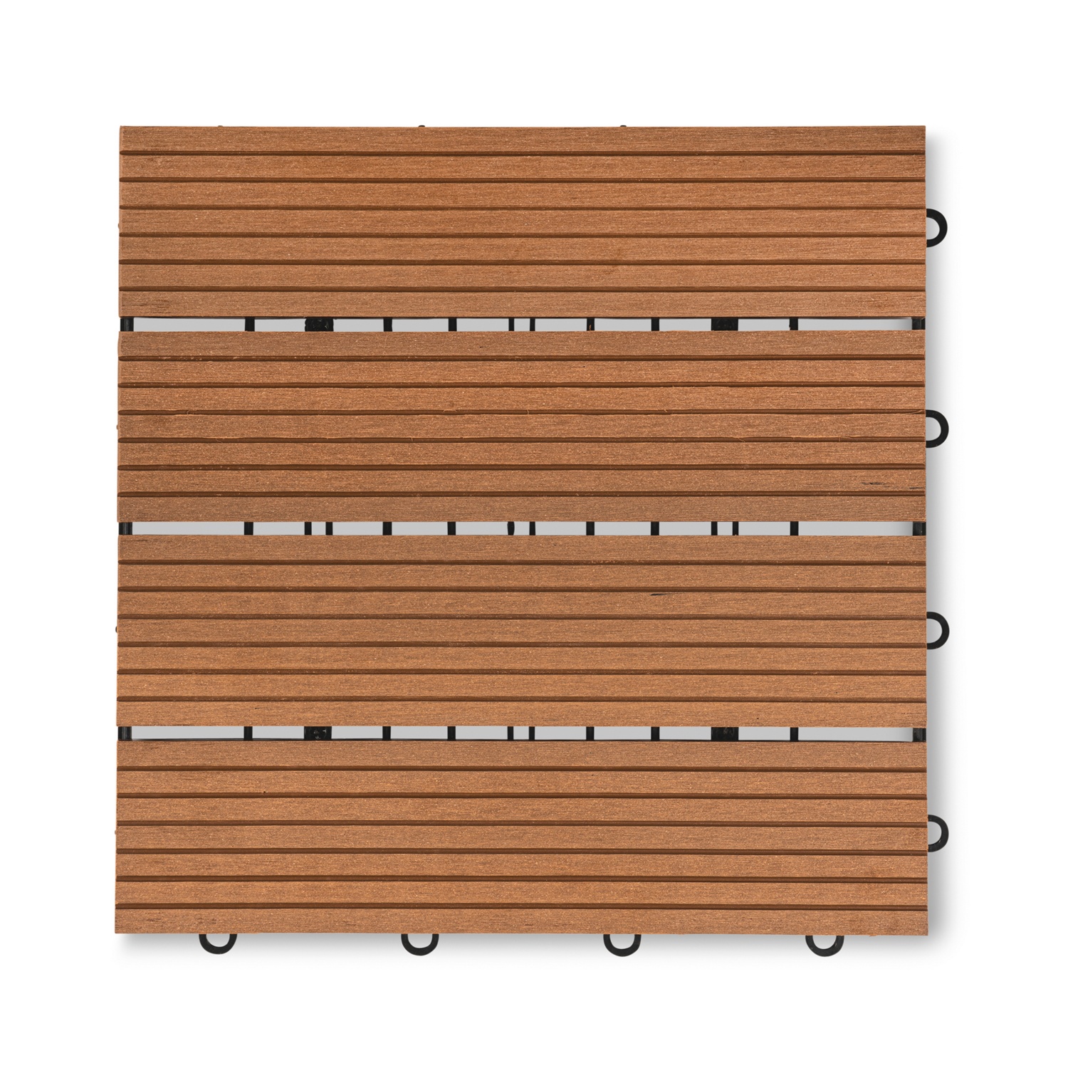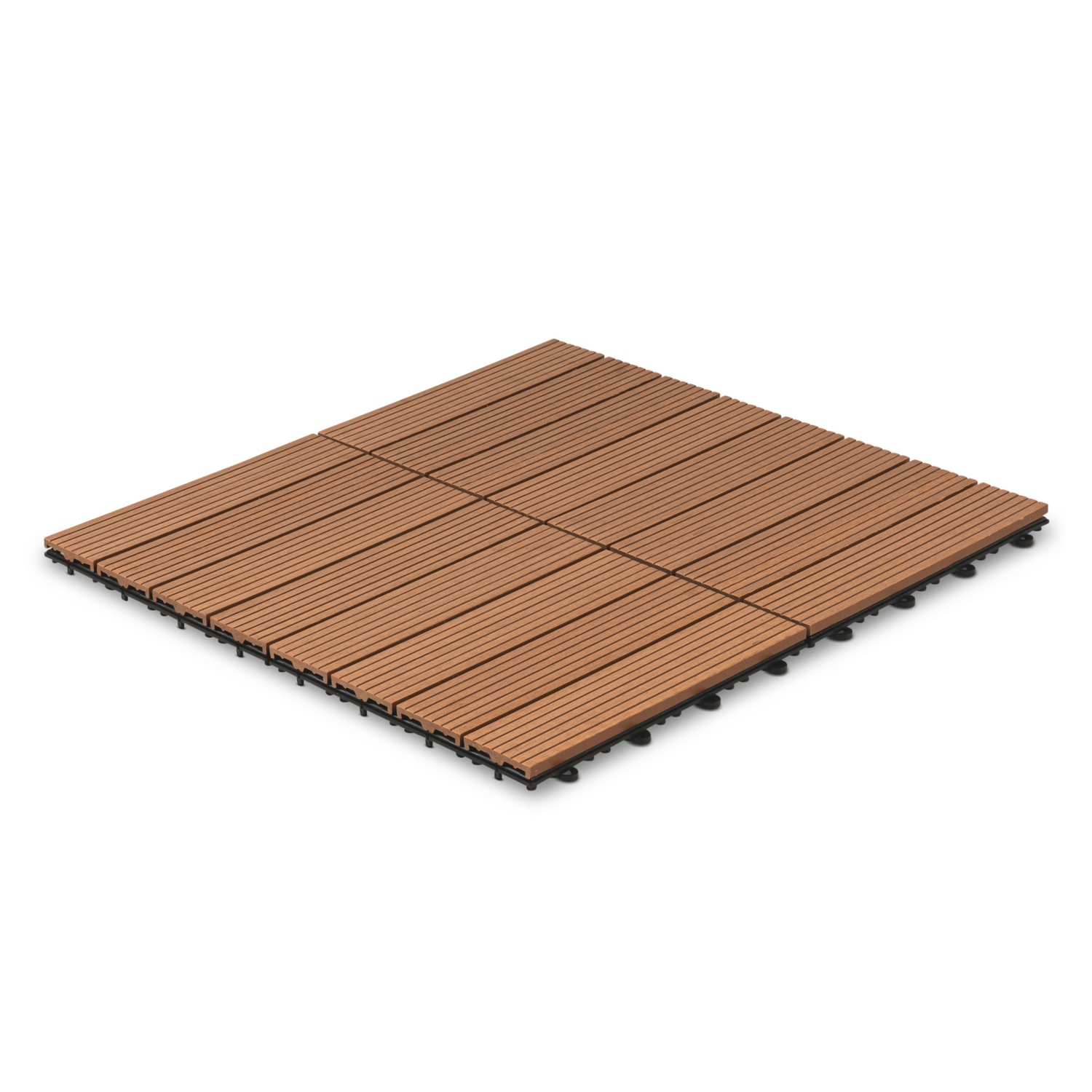 Die leichte Maserung der Oberfläche sorgt für eine überzeugende Holzoptik und machen die umweltfreundlichen Fliesen zu einem echten Highlight in Ihrem Außenbereich. Die Unterseite der Terrassenfliesen ist mit einem Drainagegitter versehen, so dass diese auch nach einem Regenguss schnell trocknen und wieder ohne Rutschgefahr begangen werden können. Das praktische Klicksystem unserer Terrassenfliesen macht das Verlegen auch auf größeren Flächen kinderleicht und schnell. Die Fliesen werden einfach ineinander verhakt, wodurch eine stabile einheitliche Fläche entsteht.