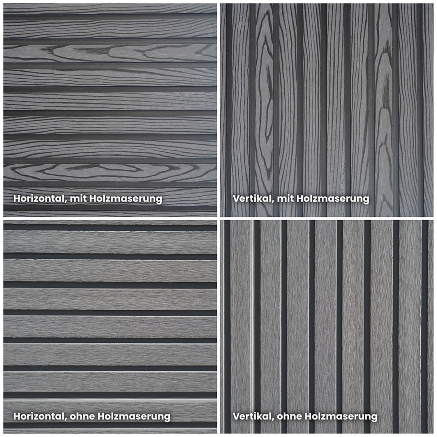 Hinweis: Hier musst du dich vor der Bestellung entscheiden, ob du es horizontal oder vertikal montieren möchtest. Beide Varianten sind mit oder ohne Maserung möglich. Eine nachträgliche oder spontane Änderung der Ausrichtung ist nicht möglich.
