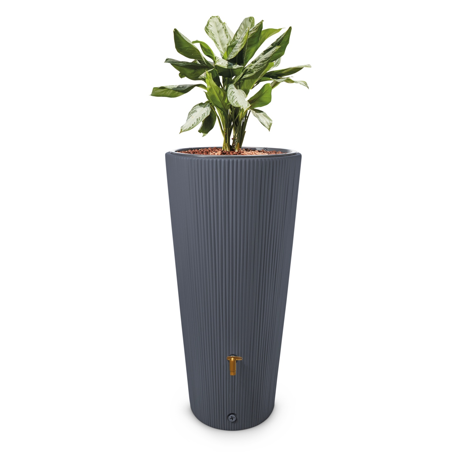 4 rain VasoDecor 2in1 Regenspeicherzinkgrau- das anschlussfertige Komplett-Set! Der Regenspeicher fasziniert durch sein außergewöhnliches und gradliniges Design, seine einzigartige Oberflächenstruktur und seine moderne zinkgraue Farbgebung. Zudem bietet er zwei nützliche Funktionen: Regenwassernutzung und Dekoration. Die herausnehmbare Pflanzschale mit einer Tiefe von 20 cm ermöglicht eine individuelle Gestaltung und lässt Ihre Regentonne somit zu einem einzigartigen Blickfang werden. Entscheiden Sie sich für eine Nachhaltige Gartenbewässerung, schonen Sie wertvolle Ressourcen und vor allem Ihren Geldbeutel. Sammeln Sie ab sofort Regenwasser, das ohnehin kostenlos vom Himmel fällt. Der Behälter bietet Ihnen hierfür ein Speichervolumen von 220 l. Zusätzlich verfügt er über zwei Gewindeanschlüsse 19 mm (3/4") zur Wasserentnahme, z. B. für die Montage des mitgelieferten Auslaufhahns, eines Schlauchsets (nicht im Lieferumfang enthalten) oder zur Restentleerung vor der Frostperiode. Besonders robust und langlebig - witterungsbeständige Materialien mit hohem UV-Schutz sorgen für eine lange Lebensdauer beim Einsatz im Freien. Bereits bei der Entwicklung eines 4rain Produkts wird sehr viel Wert auf ein nachhaltiges Produktdesign gelegt. Dieser Regenwasserbehälter wird aus Recyclingkunststoff hergestellt und ist zu 100% recycelbar. Qualität "Made in Germany". Der im Lieferumfang enthaltene Fallrohranschluss filtert zuverlässig Verschmutzungen aus dem Regenwasser, füllt den Regenspeicher automatisch und verhindert ein Überlaufen des vollen Tanks. Schlanke Bauform - nur 16 mm Abstand zwischen Fallrohr und Hauswand werden benötigt. Einfache Umstellung von Sommer- auf Winterbetrieb. Geeignet für Fallrohre mit einem Durchmesser von 70 - 100 mm (DN 70 - 100). Max. empfohlene Dachfläche 50 m². Regentonnenanschluss 25 mm (1''). Hinweis: Behälter muss bei Frostgefahr im Winter vollständig entleert werden.