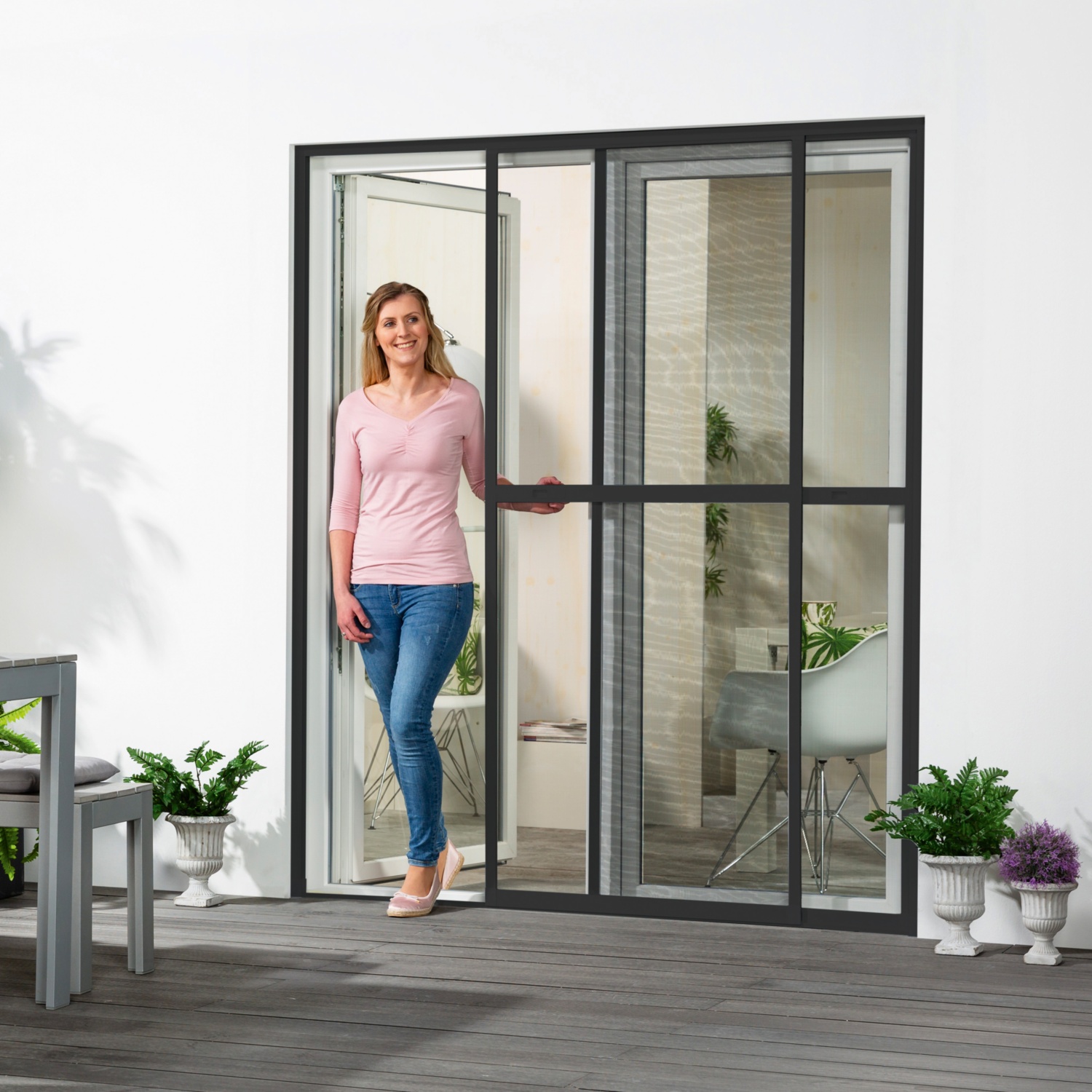 Insekten müssen draußen bleiben. Dank deiner neuen Insektenschutz-Schiebetür bleiben ungebetene mehrbeinige Gäste draußen. Die Schiebetür bietet zuverlässigen Schutz und punktet mit einer komfortablen Montage. Du kannst sie einfach per Schraubmontage in oder vor der Laibung anbringen. Für eine optimale Dichtung der Tür sorgt die umlaufende Dichtungsbürste. Mit ihrer geringen Einbautiefe von nur ca. 2,2 cm passt die Tür in so gut wie jede Laibung. Und solltest du nicht genug Platz zur Montage haben, lässt sich die Insektenschutz-Schiebetür auch ganz einfach von außen auf die Mauerlaibung schrauben. Mit der integrierten Führungsschiene und den leichtgängigen Rollen ist sie leicht zu öffnen und zu schließen, Schiene und Rollen lassen sich individuell an deine Türen anpassen.