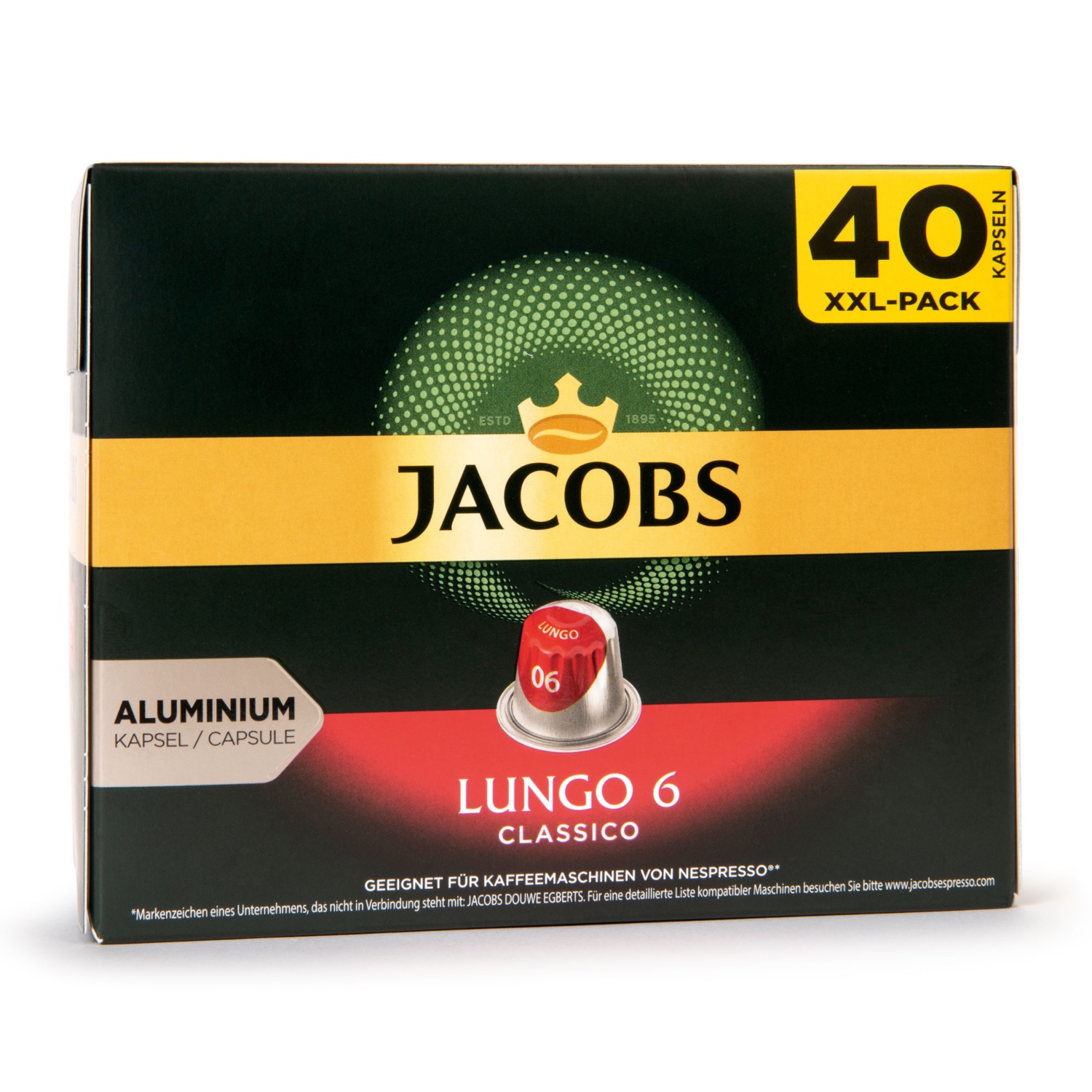 Nespresso®* Maschinen kompatible Kapseln von JACOBS in den Sorten Lungo classico, Lungo intenso und Espresso intenso.