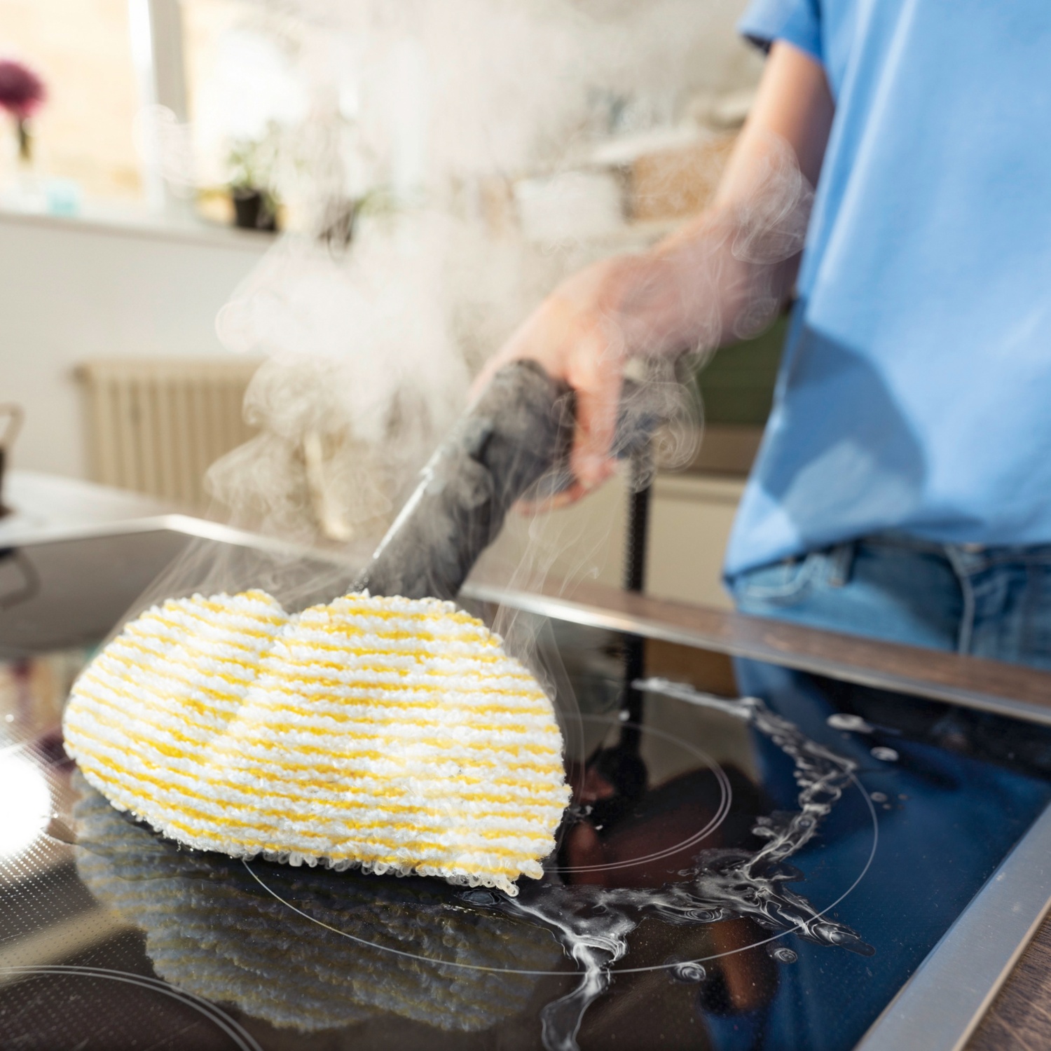 Weitere Features sind die integrierte Entkalkungskartusche, der permanent wiederbefüllbare Wassertank für unterbrechungsfreies Reinigen, das LED-Leuchtband für die Anzeige des Betriebsmodus sowie vielfältiges Zubehör für die Entfernung von hartnäckigem Schmutz auf Fliesen, Kochfeldern, Dunstabzugshauben und Fugen.