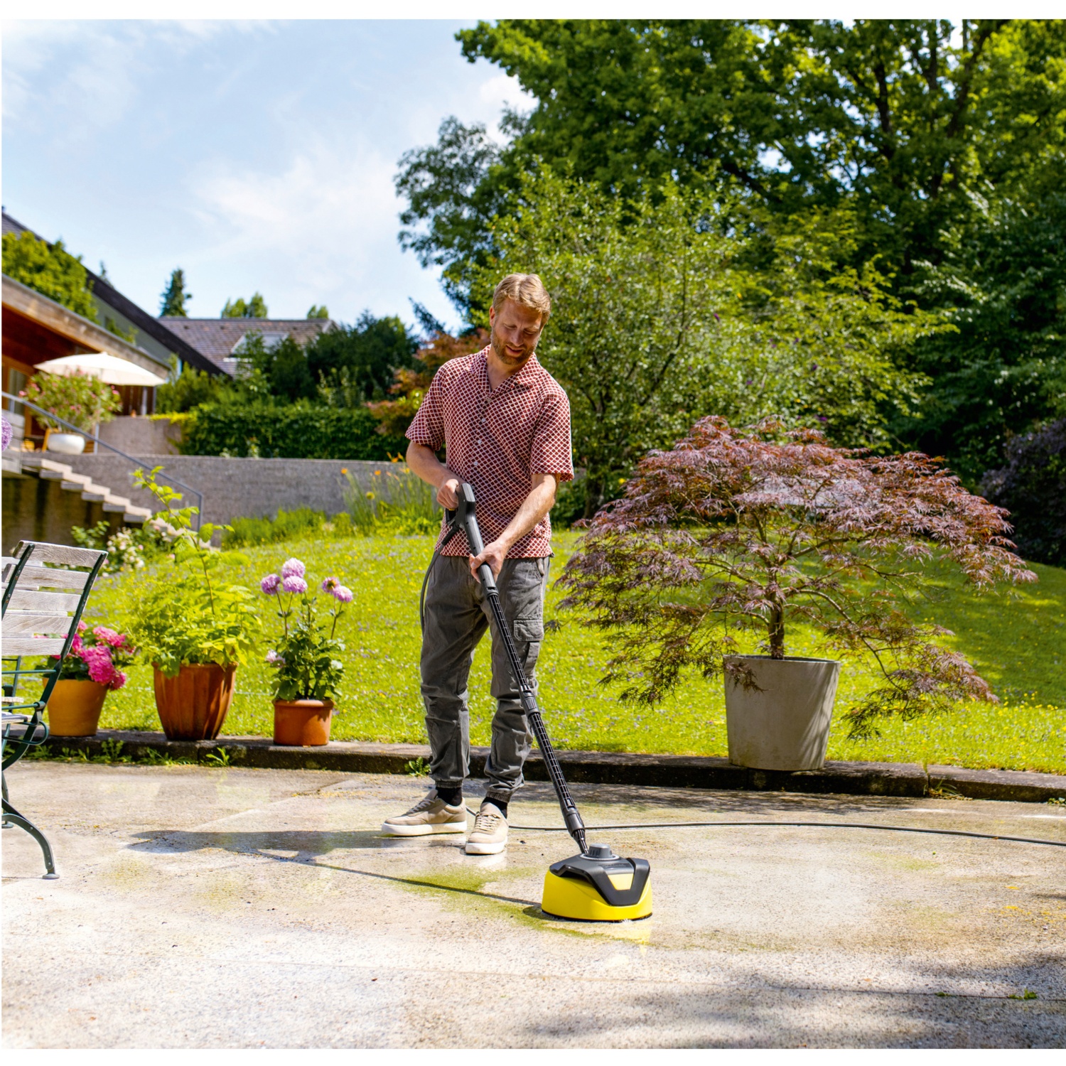 Der Hochdruckreiniger K 6 Comfort Premium Home entfernt mühelos hartnäckige Verschmutzungen rund um Haus und Auto. Inklusive Home Kit mit Flächenreiniger T 5 und 1 Liter Stein- und Fassadenreiniger für eine spritzfreie Reinigung großer Flächen. Der langlebige, wassergekühlte Motor garantiert eine durchgängig hohe Performance, und die integrierte Schlauchtrommel sorgt mit PremiumFlex-Schlauch für Flexibilität bei der Anwendung. Die ergonomische G 180 Q COMFORT!Hold Pistole reduziert den Haltedruck spürbar, wodurch selbst längere Einsätze ermüdungsfrei möglich sind. Mit Quick Connect-System lässt sich der Hochdruckschlauch schnell anschließen und trennen. Dank 4-in-1-Multi Jet-Strahlrohr kann der Wasserstrahl durch Drehen mit 4 verschiedenen Strahlbildern an jede Oberfläche angepasst werden. Zusätzlich bietet das 2-in-1-Reinigungsmittelkonzept Komfort und perfekte Reinigungsmittelausbringung je nach Anwendung. Kabel und Zubehöre lassen sich einfach am Gerät verstauen, und der Teleskopgriff und die Räder mit Weichkomponentenoberfläche ermöglichen den einfachen Transport. Unterstützung bietet die Kärcher Home & Garden App mit Anwendungsberater und nützlichen Tipps und Tricks. „Informationen zu den Warn- und Sicherheitshinweisen finden Sie in der Bedienungsanleitung” https://www.kaercher.com/at/services/support/garantiebedingungen.html