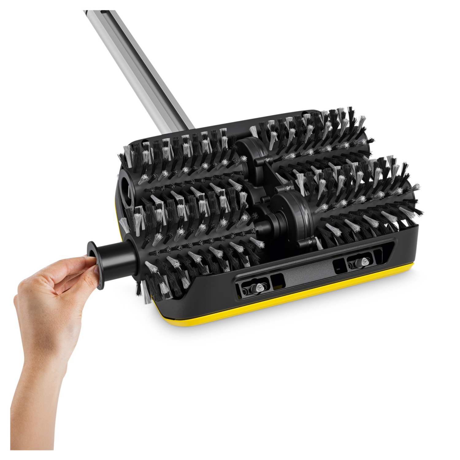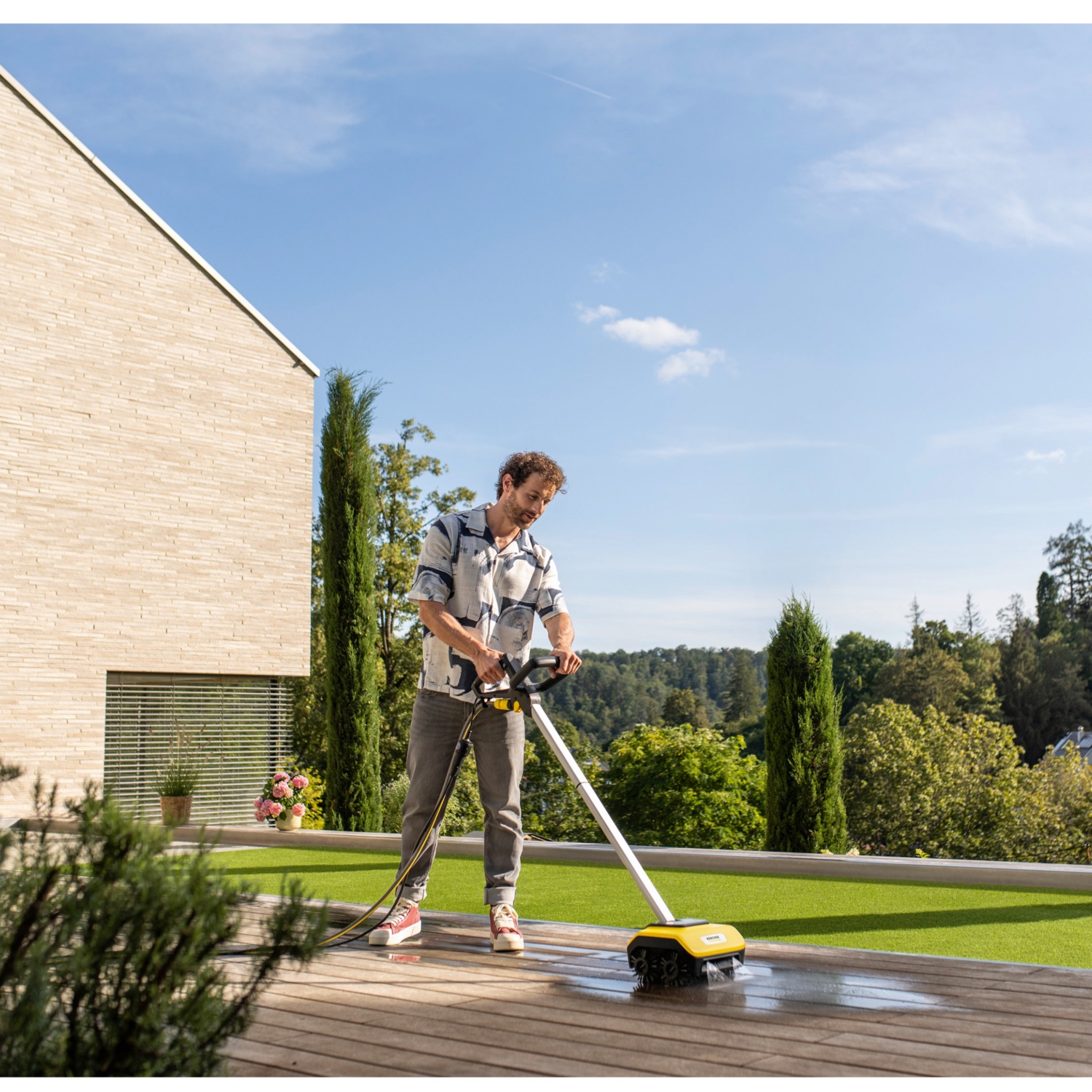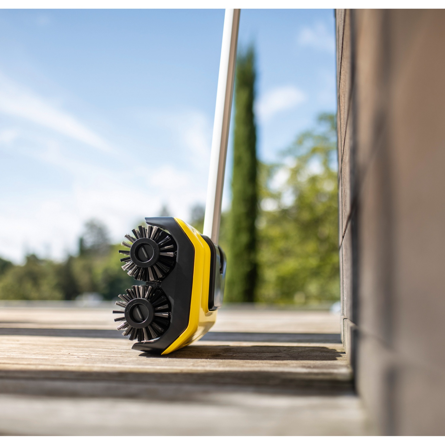 Mit dem elektrisch betriebenen PCL 6 werden Holzterrassen besonders komfortabel, gleichmäßig, schnell und gründlich von hartnäckigen Verschmutzungen befreit. Einfach das Gerät an den Gartenschlauch anschließen – schon kann mit der Reinigung begonnen werden. Dank der Kombination aus 4 rotierenden Bürstenwalzen und der regulierbaren Wasserzufuhr kann der Schmutz schnell und zuverlässig angefeuchtet sowie gleichzeitig abtransportiert werden. Mit seinem Schwebeeffekt sorgt der PCL 6 dafür, dass die Holz- oder WPC-Terrasse ohne jegliche Anstrengung gründlich sauber wird. Dabei wird nur so viel Wasser wie nötig verbraucht. Die Breite und Position der Walzen sind so ausgelegt, dass 2 Dielen in einem Schritt und bis an die Kante gereinigt werden können, was zusätzlich Zeit spart. Dank der austauschbaren Bürstenwalzen können neben Holz- und WPC-Belägen auch glatte und feinporige Steinfliesen und -platten gereinigt werden. Die Bürstenwalzen für Steinflächen sind nicht im Lieferumfang enthalten.