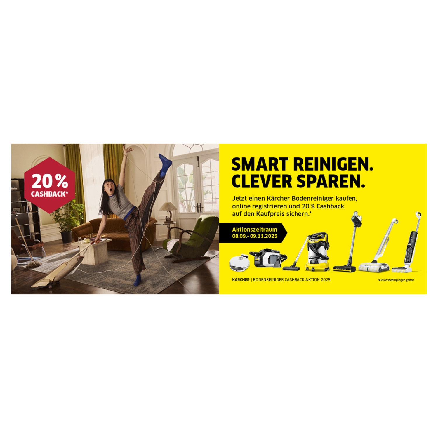 * Beim Kauf von ausgewählten Kärcher Bodenreinigungsgeräten im Aktionszeitraum 08.09. bis 09.11.2025 im teilnehmenden Handel in Österreich (inkl. Onlineshops, die in Österreich ihren Firmensitz haben) oder bei der Alfred Kärcher GmbH Österreich direkt, erhalten Sie nach Online-Registrierung unter https://cas5-0-urlprotect.trendmicro.com:443/wis/clicktime/v1/query?url=www.kaercher.at%2fbodenreiniger%2daktion&umid=32a1772b-71cf-11f0-90ed-7c1e526191d0&rct=1754379521&auth=3bd1ed0ea25e030aebac2180cda48b2d7a1ccc30-9f45214ed930153155a9a4948688d8957befae61 je nach gekaufter Gerätevariante einen Cashback von 20 % auf dem Kaufbeleg ausgewiesenen Kaufbetrag (Refurbished-Produkte ausgenommen). Die Online-Registrierung muss bis zum 07.12.2025 erfolgen. Für die Registrierung ist die Angabe der Artikelnummer des Neugeräts, Ihre Daten einschließlich Ihrer gültigen Bankverbindung sowie der Upload des Kaufbelegs erforderlich. Ein Anspruch auf Auszahlung in bar besteht nicht. Bei Rückgabe des Geräts besteht kein Anspruch auf den Cashback. Sollte der Kunde sein gesetzliches Rücktrittsrecht in Anspruch nehmen, ist der gewährte Cashback-Betrag an den Anbieter zurückzuerstatten. Pro Haushalt können max. zwei Aktionsgeräte für die Aktion registriert werden. Die Aktion ist ausschließlich für Endverbraucher zugelassen. Die Auszahlung kann bis zu 28 Tage dauern. Vollständige Infos, eine Auflistung aller Aktionsgeräte und Aktionsbedingungen unter: www.kaercher.at/bodenreiniger-aktion.
