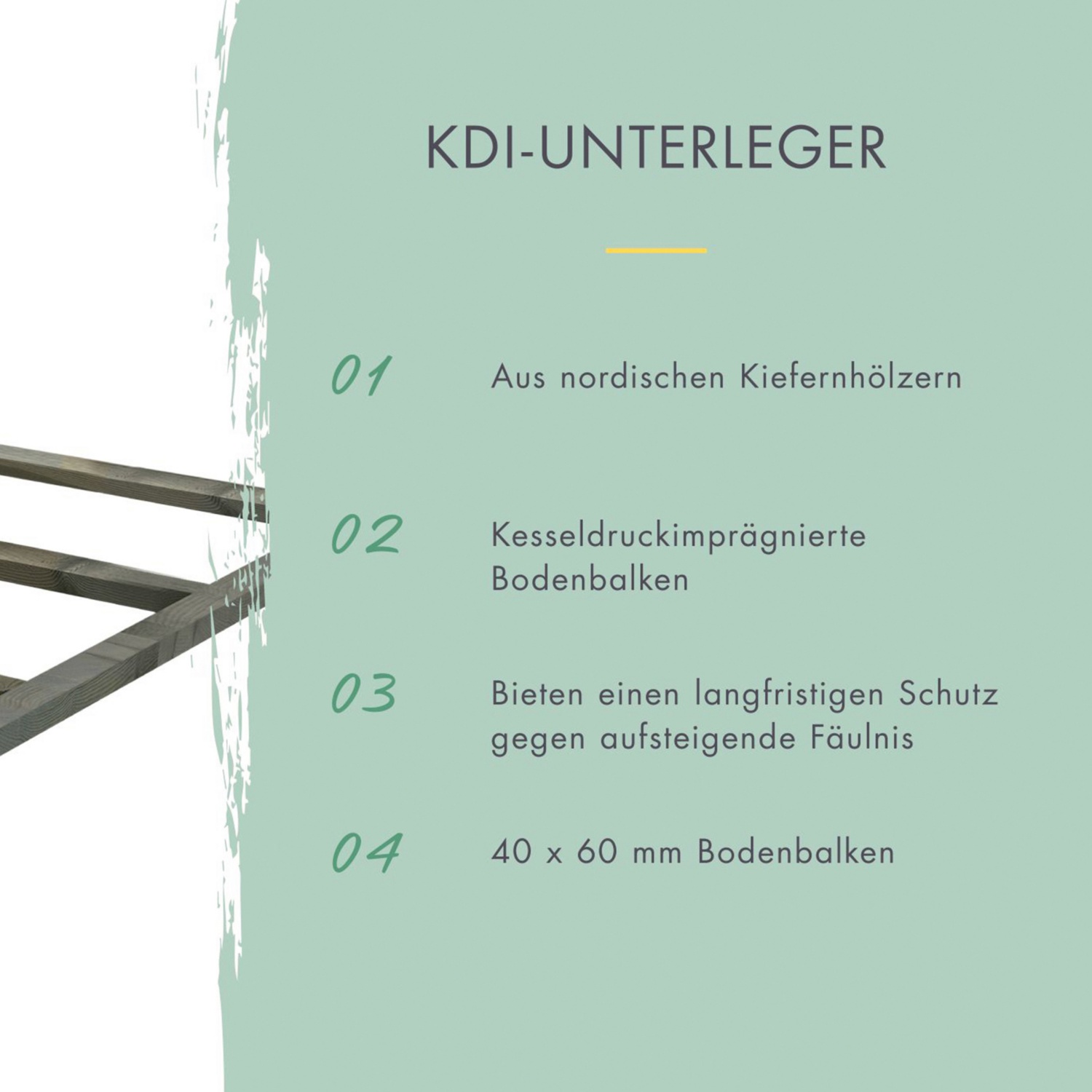 Mit diesem hochwertigen Fußboden aus Massivholz schützen Sie die Gegenstände im Gartenhaus vor aufsteigender Feuchtigkeit. Durch die Bauweise mit Nut- und Federbrettern ist der Boden schnell und einfach zu verlegen. Mithilfe der, im Lieferumfang enthaltenen Bodenbalken sorgen Sie für den nötigen Abstand zum Boden.