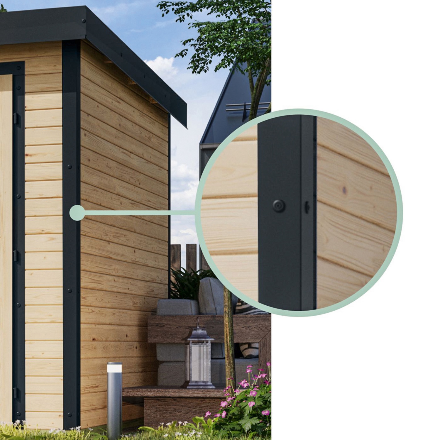 HochwertigeMaterialien wie nordische Fichte, Stahlecken und Trapezblechdach