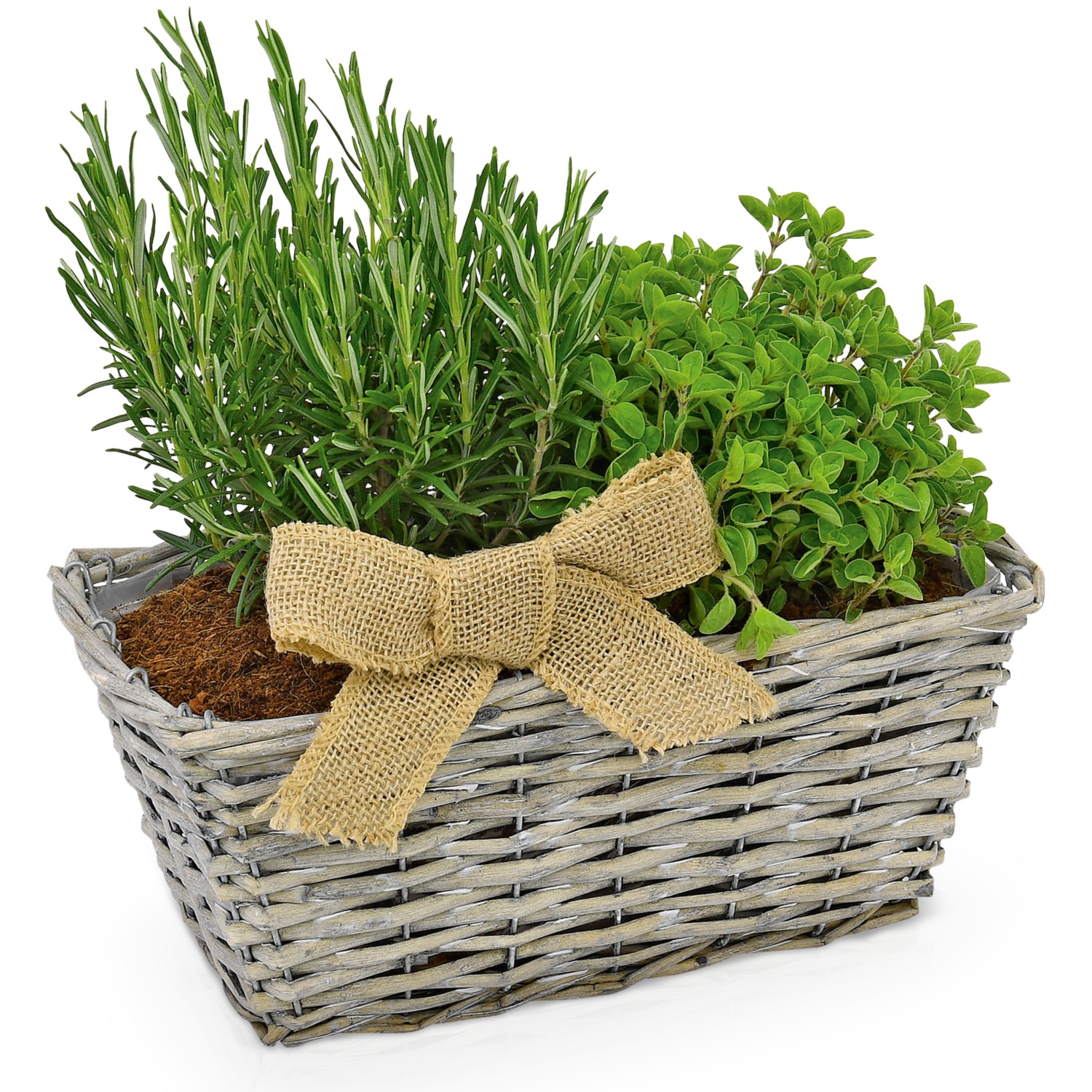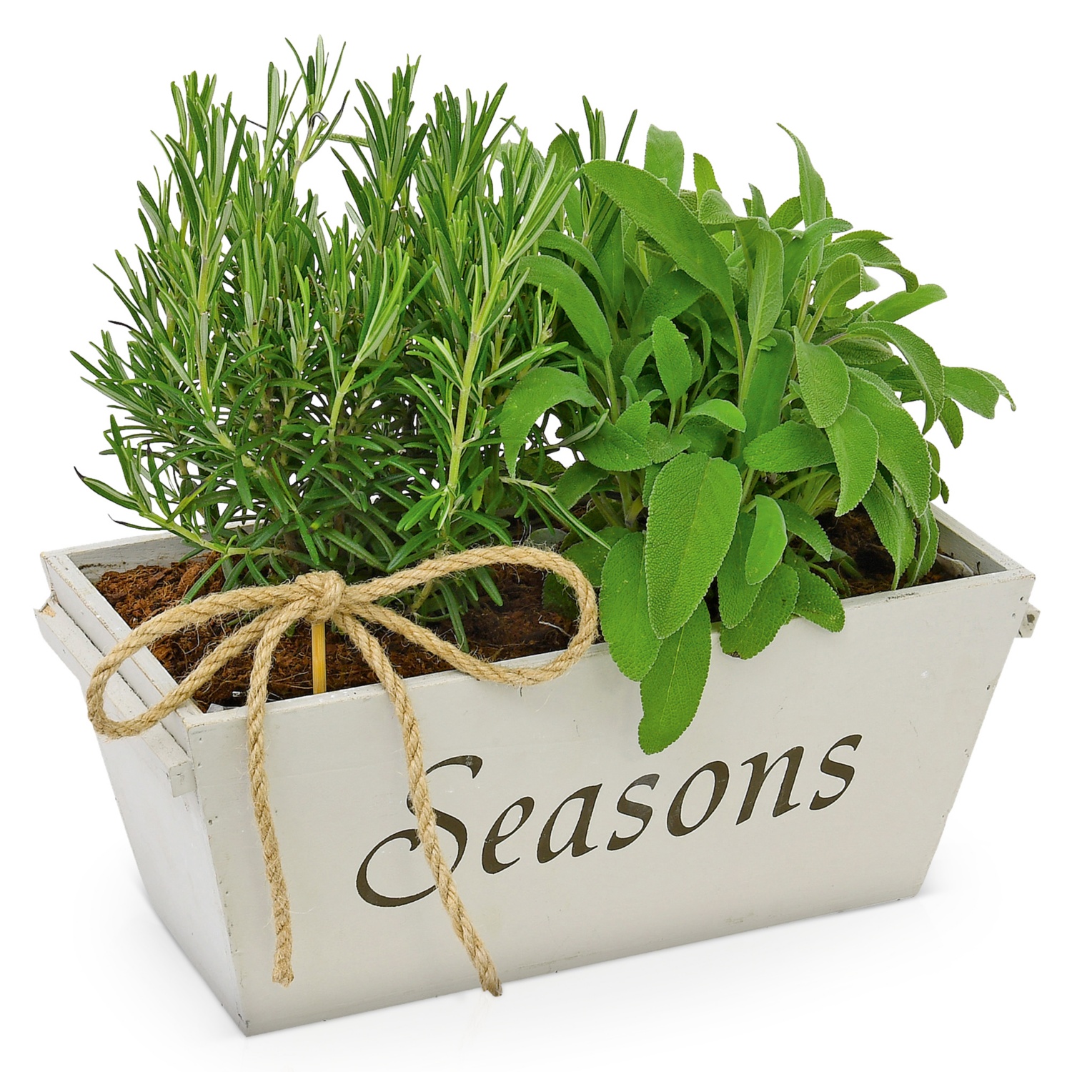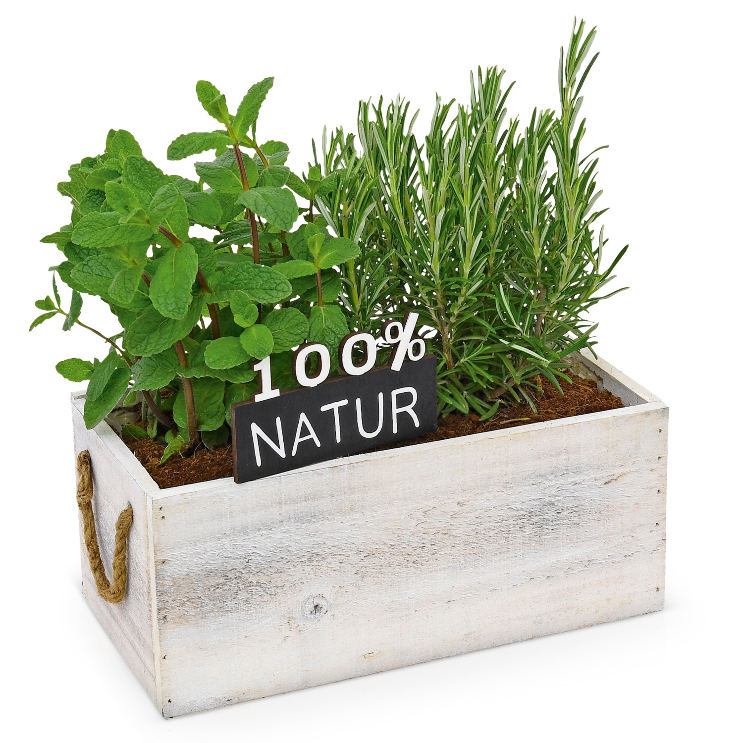 zweierlei Kräuter in einem dekorativen Korb/Kasten, Mix aus Rosmarin, Minze, Salbei etc.