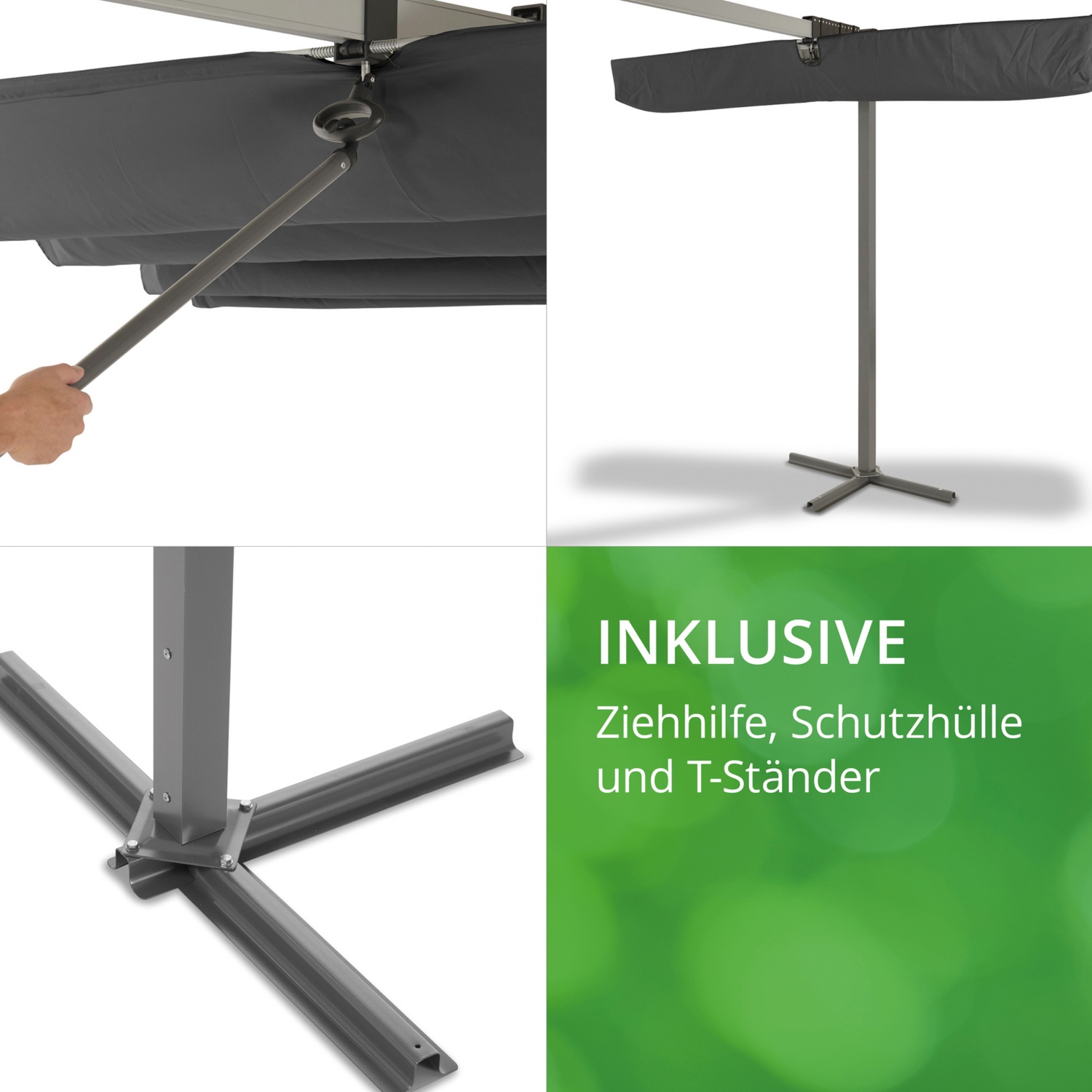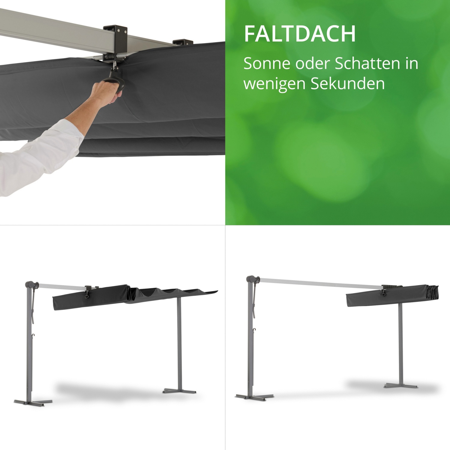 • Einfache Montage des Sonnendaches / Gestell aus pulverbeschichtetem Aluminium und Stahlrohr / Robuste Kreuzständer aus pulverbeschichtetem Stahlrohr / Dachtextil aus 100 % Polyester, wetterbeständig, wasserabweisend beschichtet