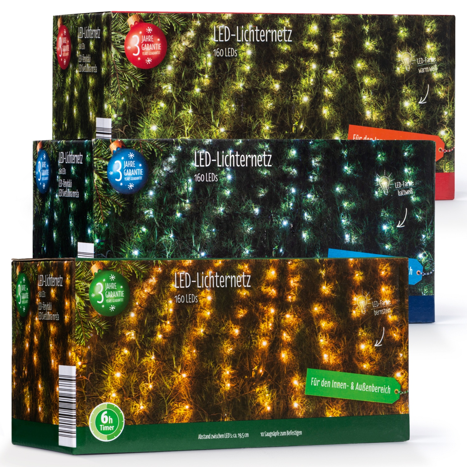 • ​​​​​​​LED-Außenlichternetz:160 LEDs, Netzgröße: 320 x 150 cm, inkl. 10 Saugnäpfe mit Haken zur Befestigung
