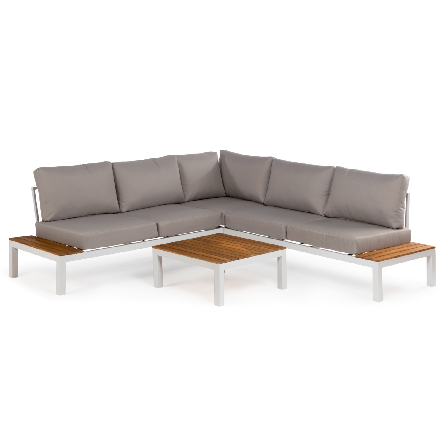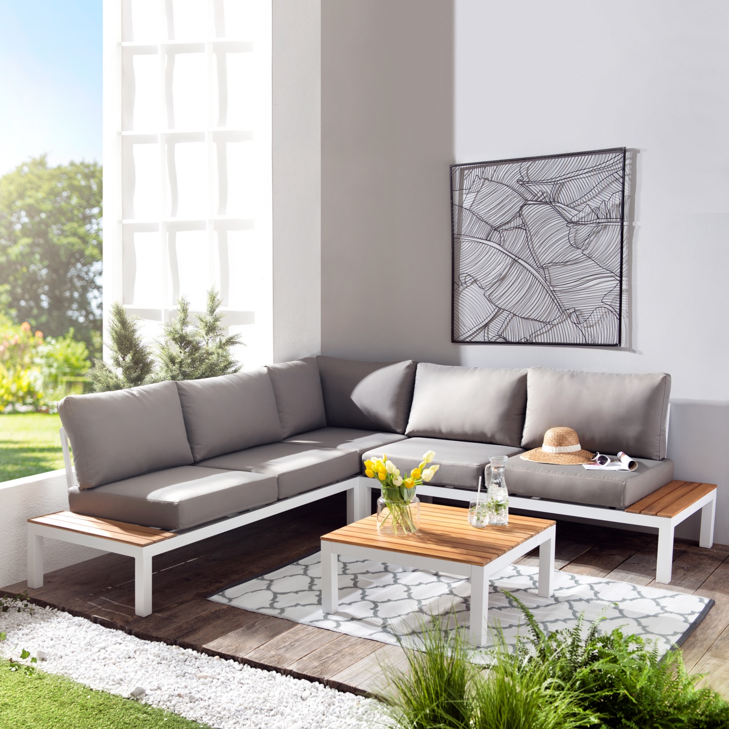 • hochwertige Eck-Sitzgarnitur aus zertifiziertem Akazienholz und pulverbeschichtetem Aluminium