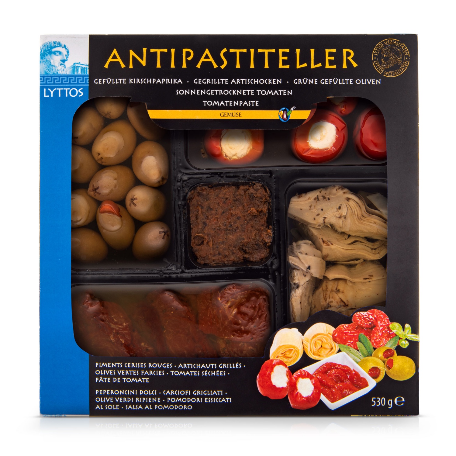mit verschiedenen griechischen Antipasti, eingelegt in Sonnenblumenöl