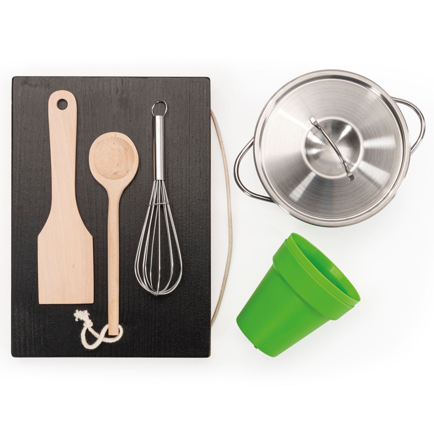 • inkl. Topf mit Deckel, Schneebesen, Pfannenwender, Schöpfkelle, 2x Blumentöpfe aus Kunststoff, Maltafel zum Aufhängen
