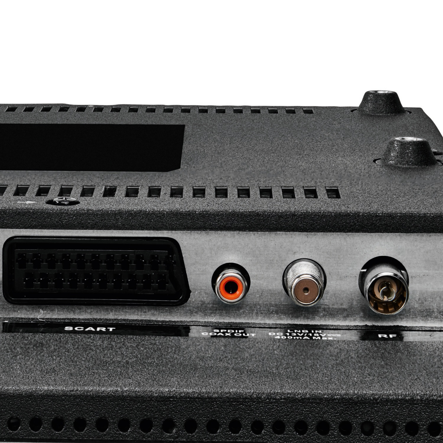 • Satellitenanschluss, Antennenanschluss, 1 x USB, 2 x HDMI® mit HDCP-Entschlüsselung, 1 x SCART, AV In (Adapter 3,5 mm Klinke auf Cinch), YPbPr In (Adapter 3,5 mm Klinke auf Cinch), Kopfhöreranschluss (3,5 mm Klinke), Digital Audio Out (SPDIF) (koaxial)