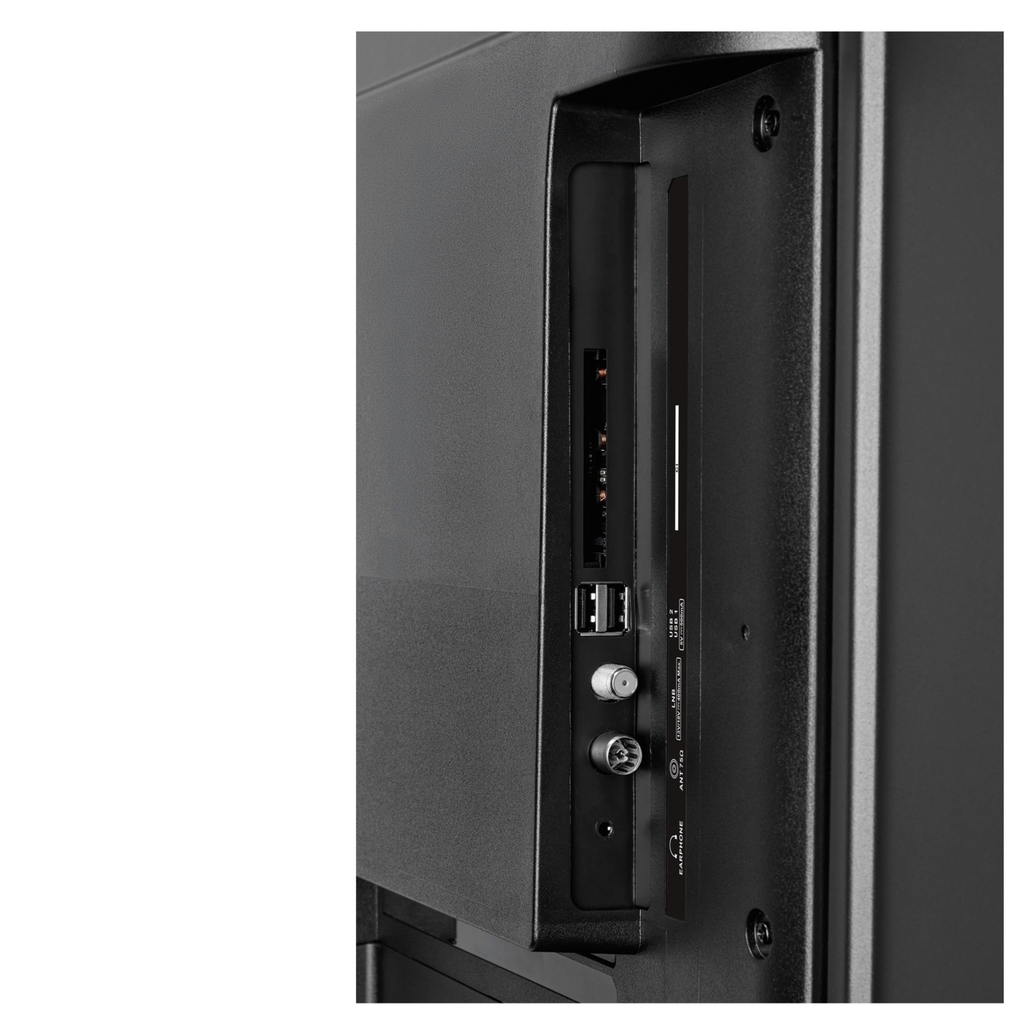 • Antennenanschluss, Satellitenanschluss, 2 x USB, 1 x LAN RJ-45, 3 x HDMI® 2.0 mit HDCP 2.2 – Entschlüsselung, Kopfhöreranschluss (3,5 mm Klinke), Digital Audio Out (SPDIF) (optisch), AV In (Cinch)