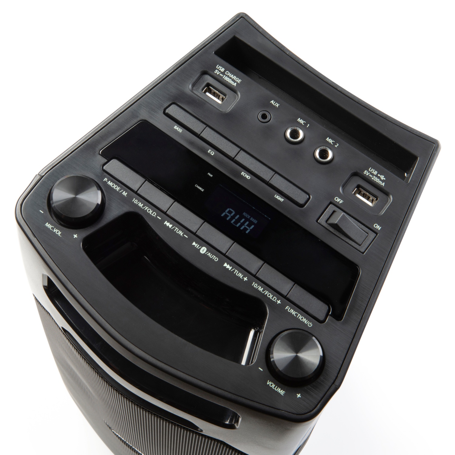 • 1xUSB-Anschluss zur Musikwiedergabe von MP3-Dateien, 1x USB-Ladeanschluss, 1x AUX-Anschluss (3,5 mm) zum Verbinden externer Geräte wie z. B. MP3-Player, 2x Mikrofonanschluss (6,3 mm)
