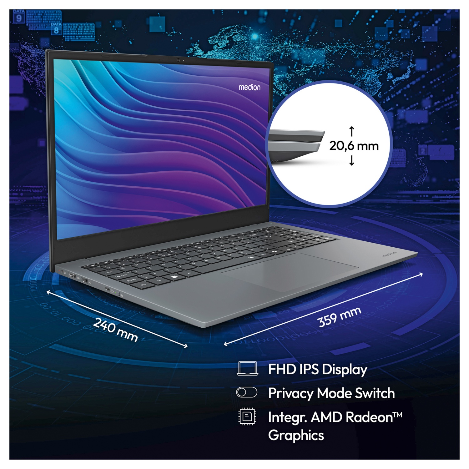 • 39,6 cm (15,6”) FHD Display mit einer Auflösung von 1.920 x 1.080 Pixel
