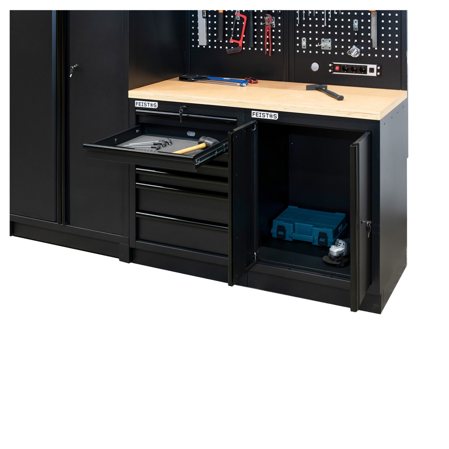 Schwarz, zeitlos und kraftvoll wie ein zielgenauer Hammerschlag auf den Amboss: Das ist die EOS Blackline, die progressive Werkstatteinrichtung von FEISTOS!