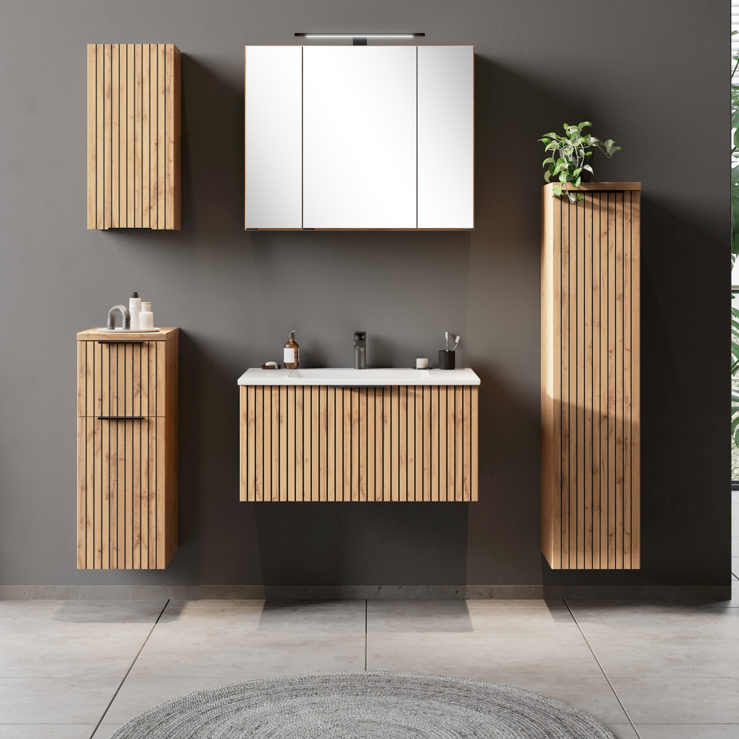 • in Wotaneiche-Dekor mit schwarzen Akzentstreifen