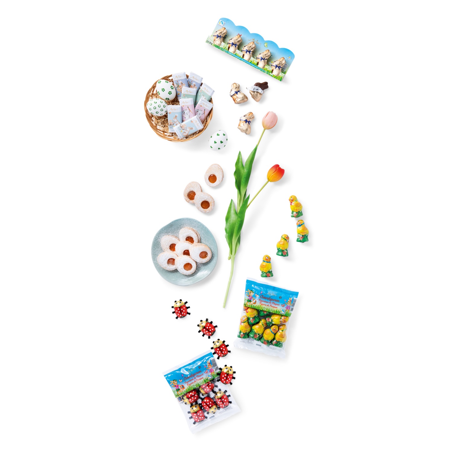 aus Milchschokolade, einzeln verpackt. In zwei veschiedenen Designs.