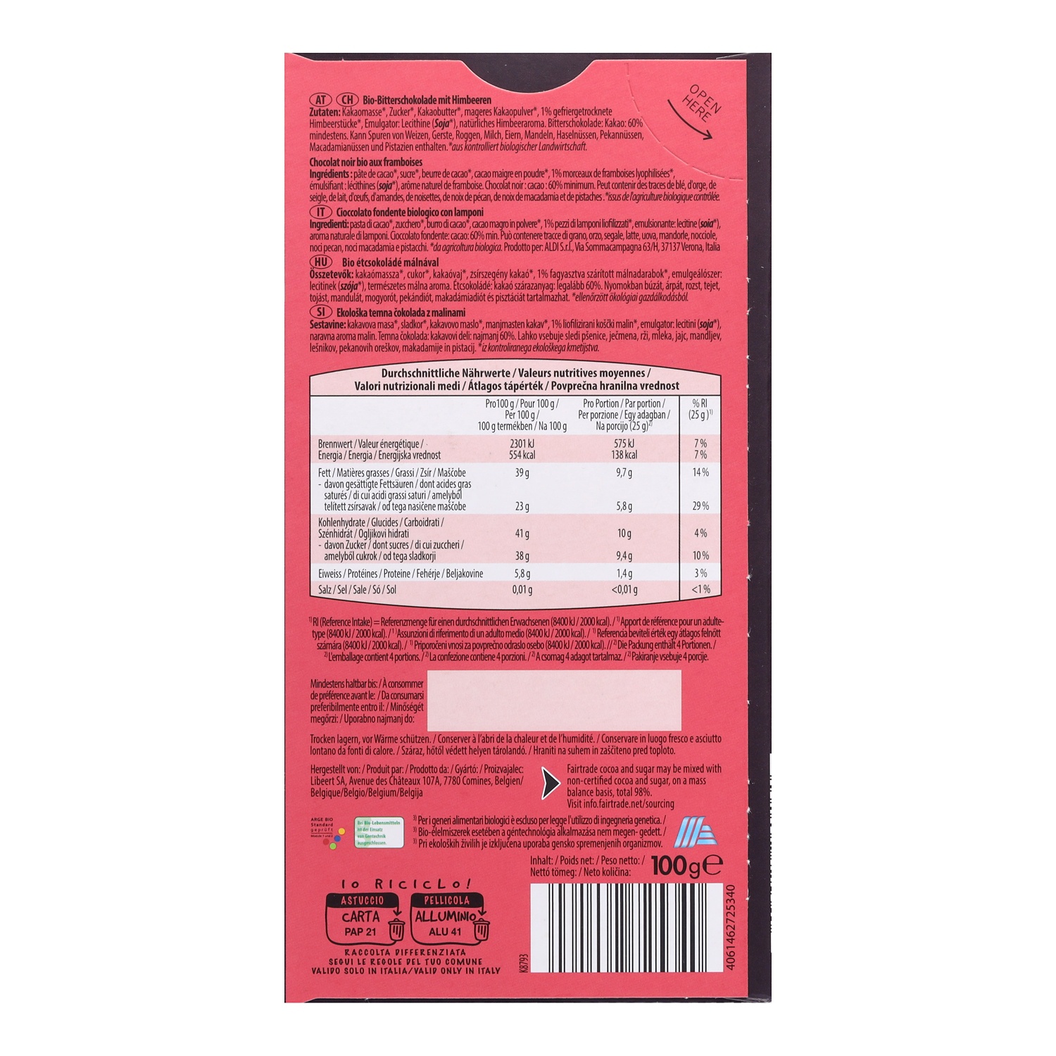 MOSER ROTH BIO-Schokolade, Bitterschokolade mit Himbeeren