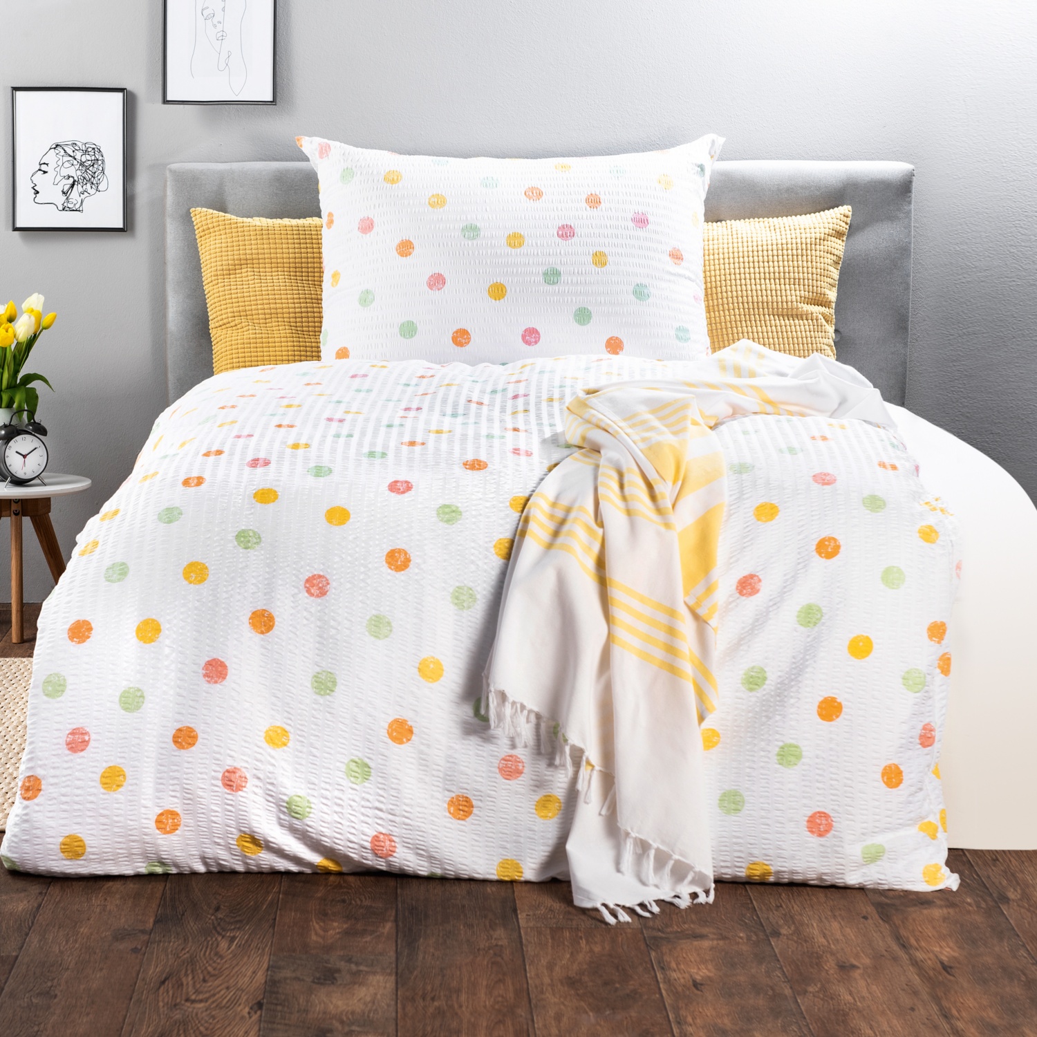 mit Reißverschluss, Polster: Gr. 70 x 90 cm, Tuchent: Gr. 140 x 200 cm Seersucker-Effekt: Durch eine maschinelle Prägung erhält glattgewebte und bedruckte Ware die charakteristisch gerunzelte, leicht wellige Streifenoberfläche von Seersucker ohne chemische Zusätze. Dadurch ist die Ware besonders atmungsaktiv, pflegeleicht und formbeständig.
