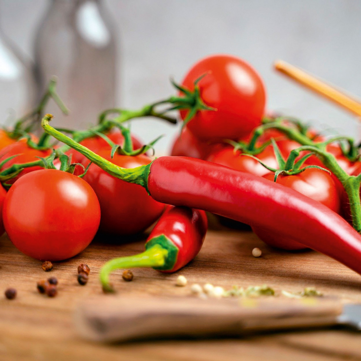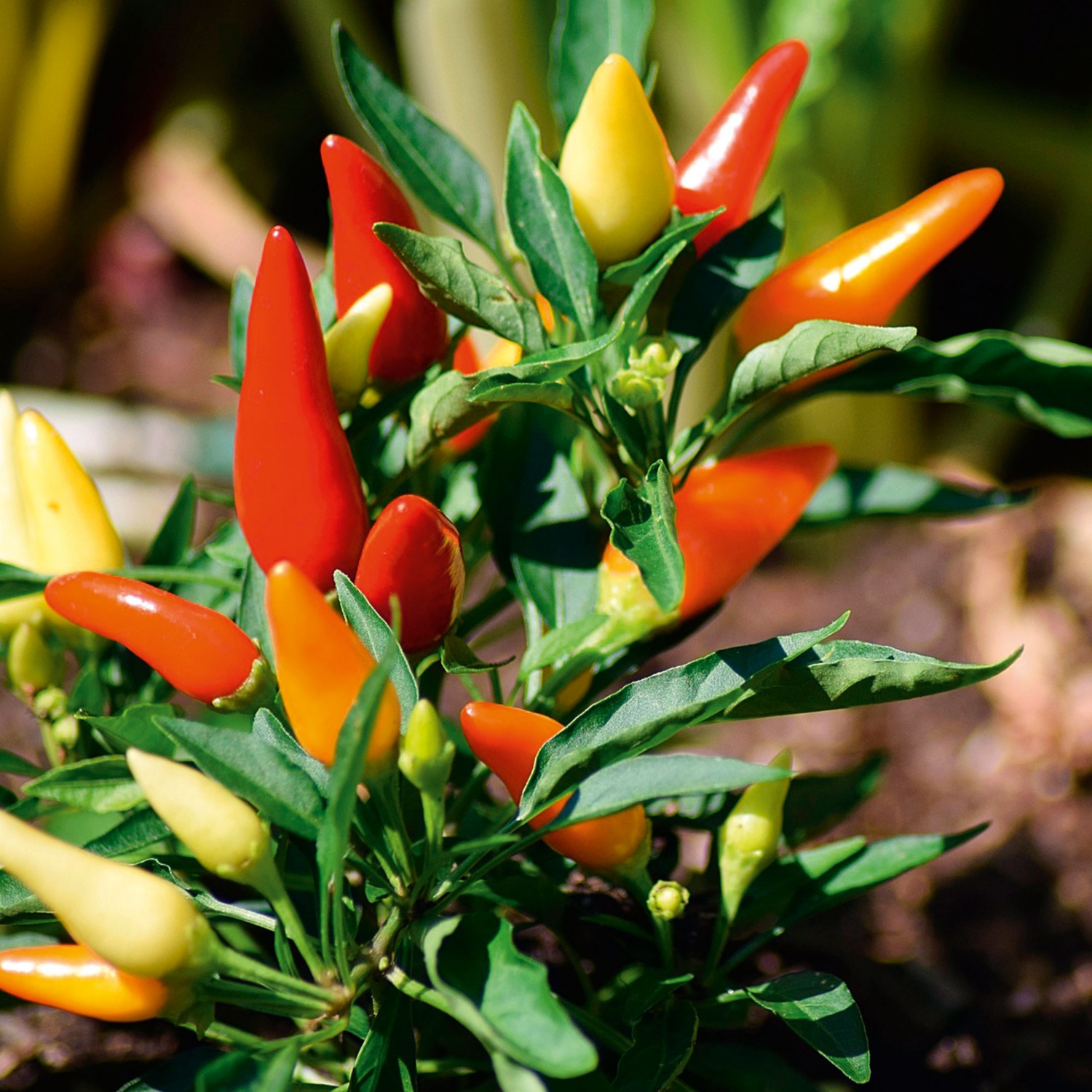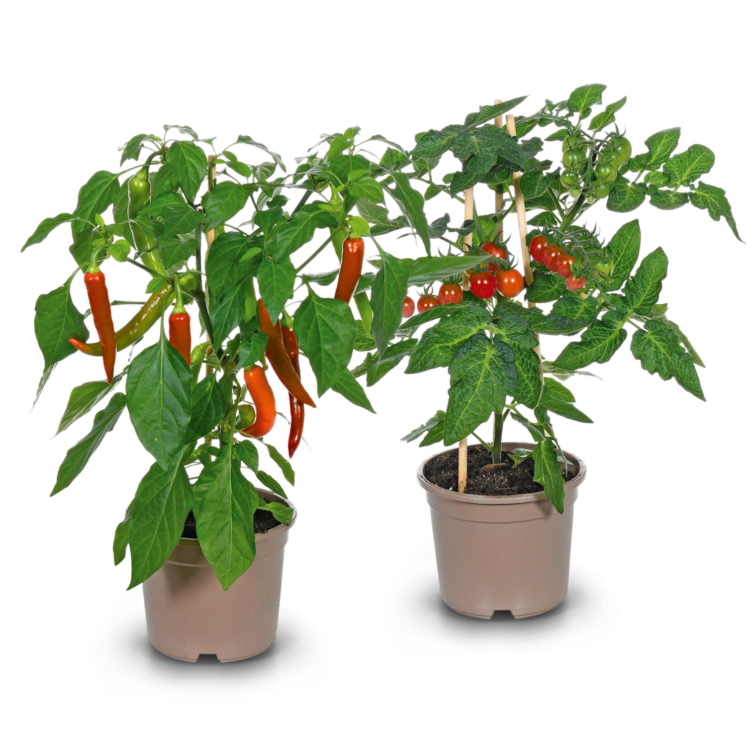 im 17-cm-Topf, Pflanzenhöhe inkl. Topf: ca. 40-60 cm, verschiedene Gemüsesorten mit voll ausgereiften, sowie weiteren Früchten in unterschiedlichen Reifestadien