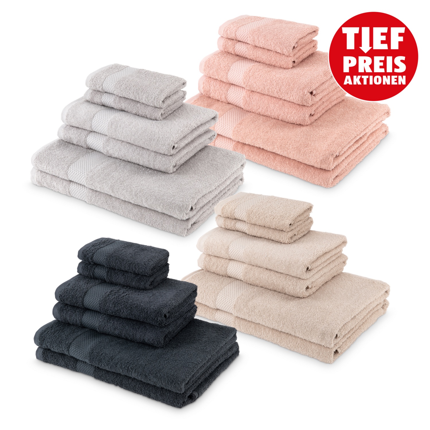 Das NOVITESSE Frottier-Set mit 6 Teilen besteht aus 2 Badetüchern (70 x 140 cm), 2 Handtüchern (50 x 100 cm) und 2 Gästetüchern (30 x 50 cm) und ist in den Farben Grau, Anthrazit, Taupe und Rosa erhältlich.Die weichen und saugfähigen Handtücher sind aus reiner Baumwolle gefertigt.