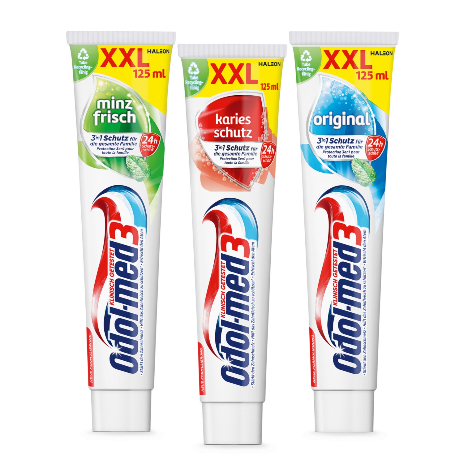 Odol-med3 Kariesschutz: Die Zahnpasta stärkt den Zahnschmelz von innen und bildet einen Schutzschild um den Zahn und erfrischt den Atem.