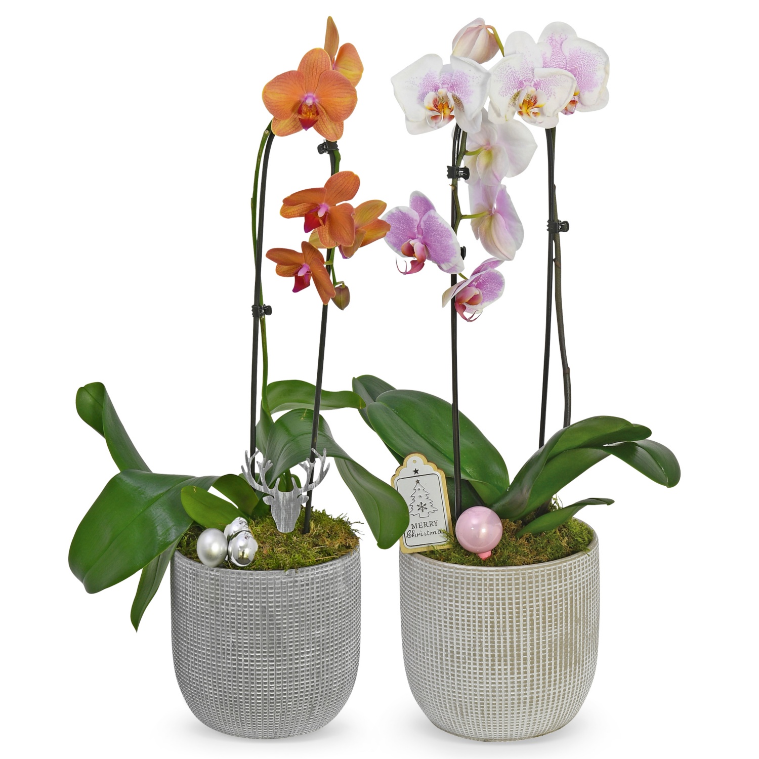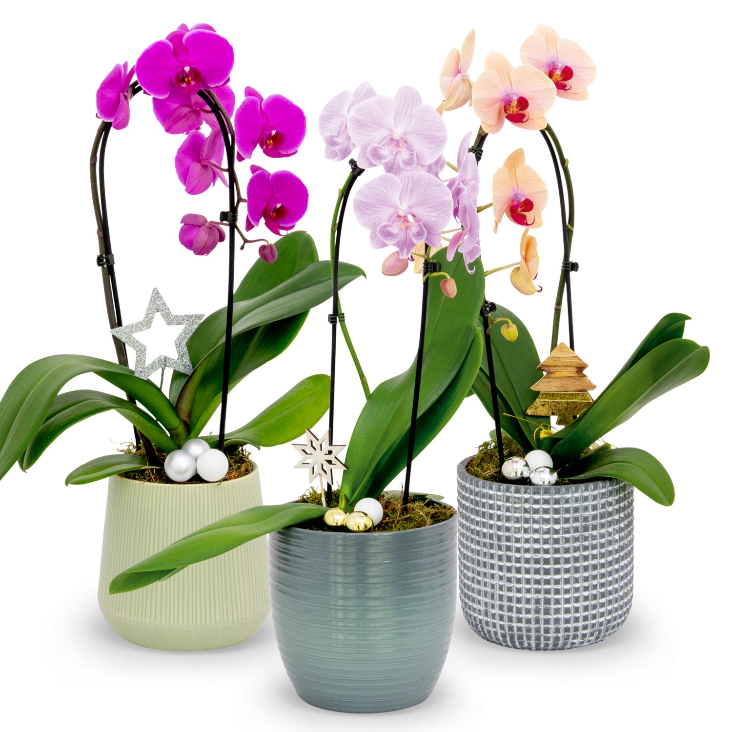 im hochwertigen Übertopf: Ø 14 - 19 cm (je nach Modell), Höhe inkl. Topf: 40 - 60 cm, mit einem Trieb in Bogenform, weihnachtlich dekoriert
