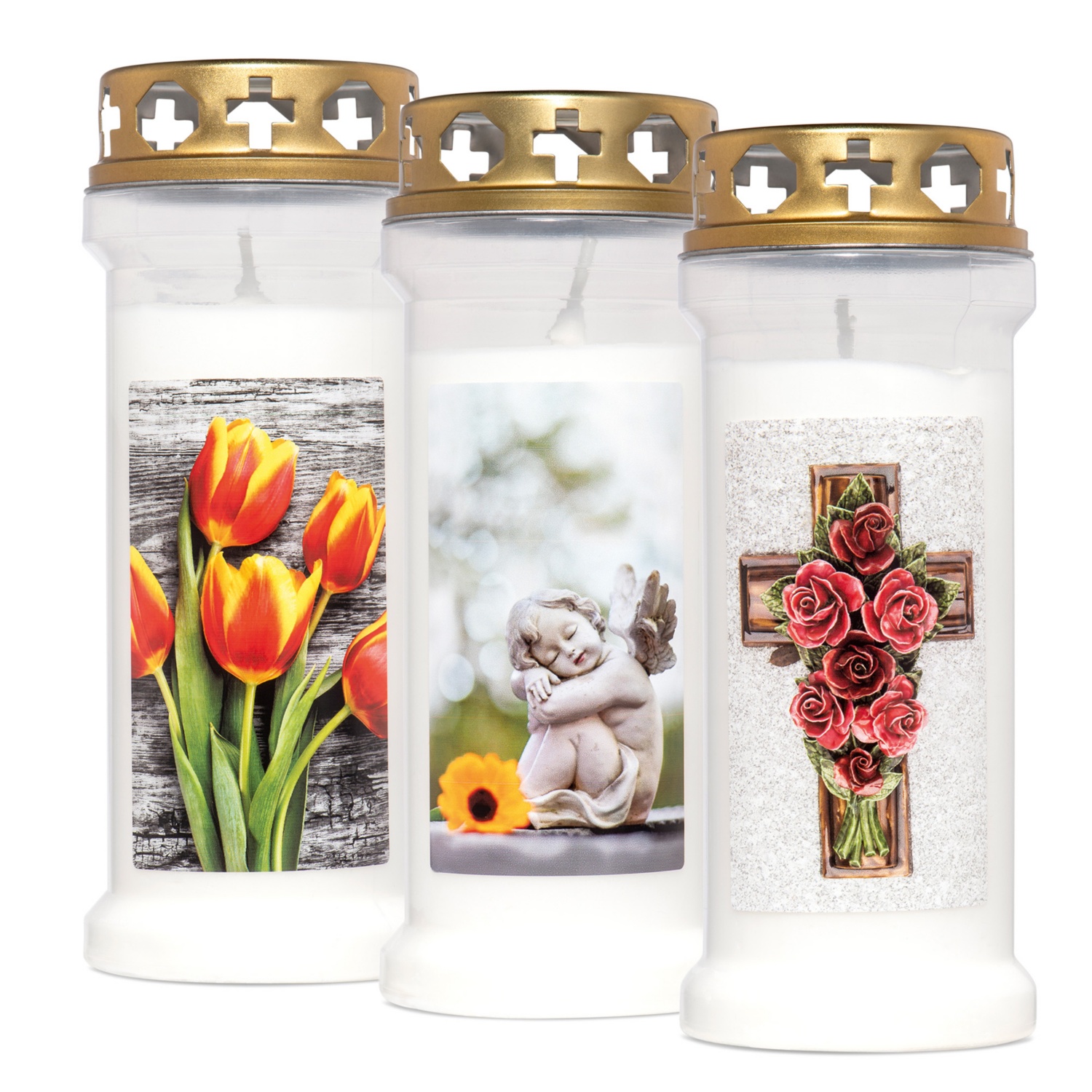 • Grabkerze mit goldfarbenem Deckel und Motivbild