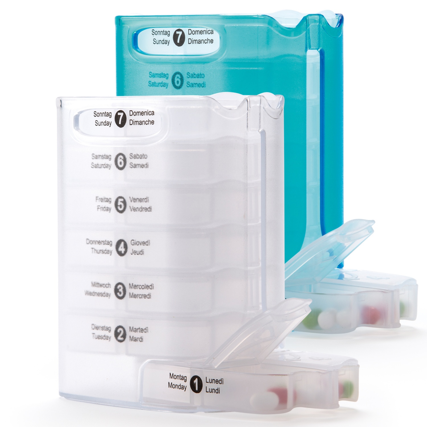 • transparente Einzeldosierer mit 4 Unterteilungen für morgens, mittags, abends und nachts