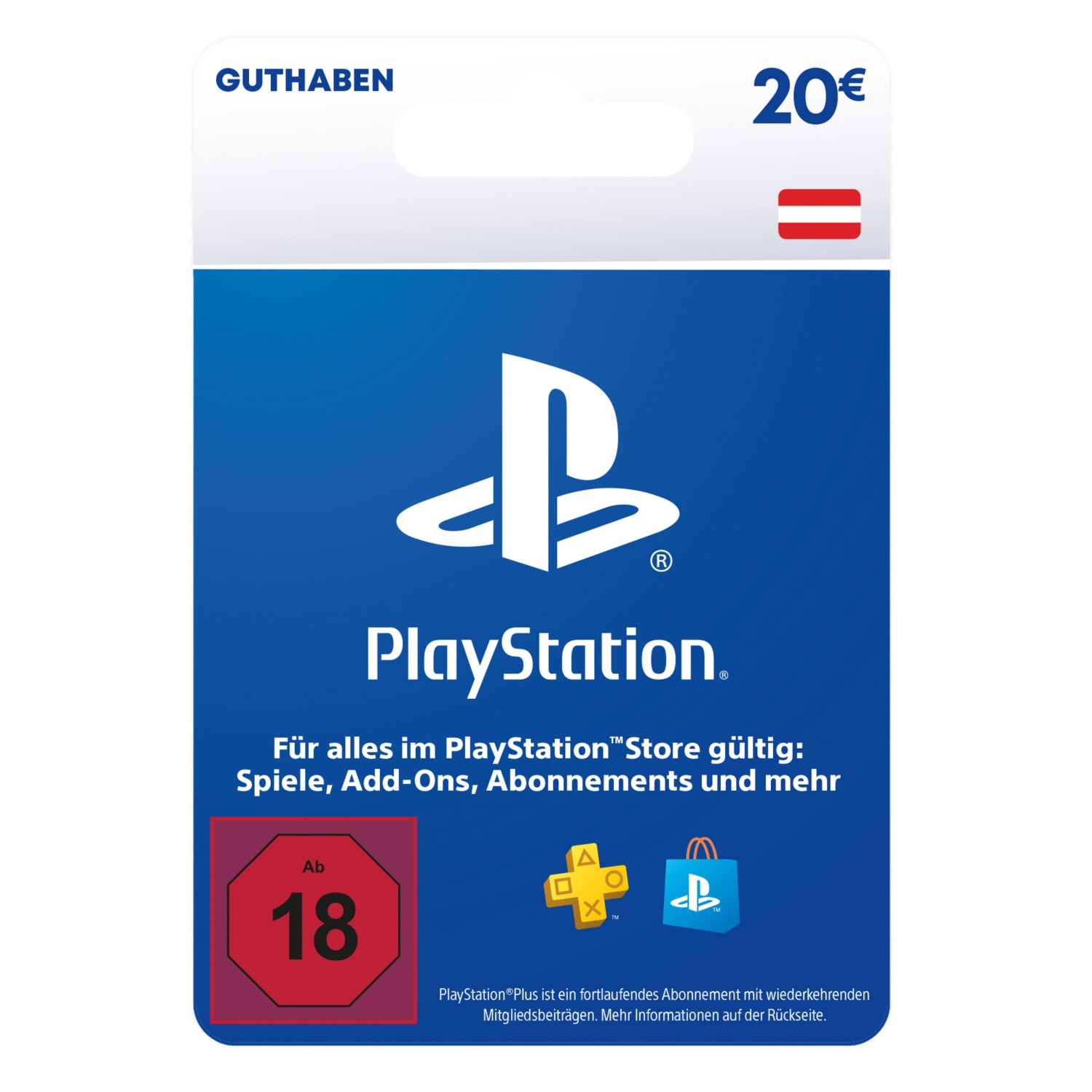 Dein Guthaben für das PlayStation Universum! Wähle aus tausenden PlayStation-Spielen, Spielerweiterungen, Mitgliedschaften und vielem mehr: - Für PlayStation Games, Add-Ons, In-Game Währungen und alle anderen Inhalte, die das Spielerherz begeistern - Wähle die passende PlayStation Plus Mitgliedschaft für dich - Sicher und einfach einkaufen im PlayStation Store - Alle Inhalte wann und wo du willst - Das perfekte PlayStation-Geschenk Einfach einlösen - So geht´s: 1. Melde dich bei deinem PSN-Konto an 2. Gehe zum PlayStation Store 3. Wähle die Option "Code einlösen" aus 4. Gutscheincode eingeben und bestätigen Nutzungsbedingungen: PSN-Guthaben kann vom Kontoinhaber (und seinen Familienmitglieds-Konten) verwendet werden, um Artikel im PS Store zu kaufen, die Kontoinhabern aus Österreich zur Verfügung stehen. Die Nutzung des Codes unterliegt diesen Bedingungen sowie den Allgemeinen Geschäftsbedingungen, den Datenschutzrichtlinien, den Gutscheincode-Bedingungen, den Software-Nutzungsbedingungen auf www.playstation.com/legal. Kaufe diesen Code nicht, wenn du diese Bedingungen nicht akzeptierst. Vorbehaltlich geltender örtlicher Gesetze ist der Code nicht gegen Bargeld einlösbar und kann nicht weiterverkauft oder anderweitig umgetauscht werden. Gutscheincodes werden nicht ersetzt, wenn sie verloren gehen oder gestohlen, nach dem Kauf beschädigt oder anderweitig ohne deine Zustimmung verwendet werden. Der Code gilt nur für eine einmalige Benutzung. Kompatibles System und Internetverbindung benötigt.