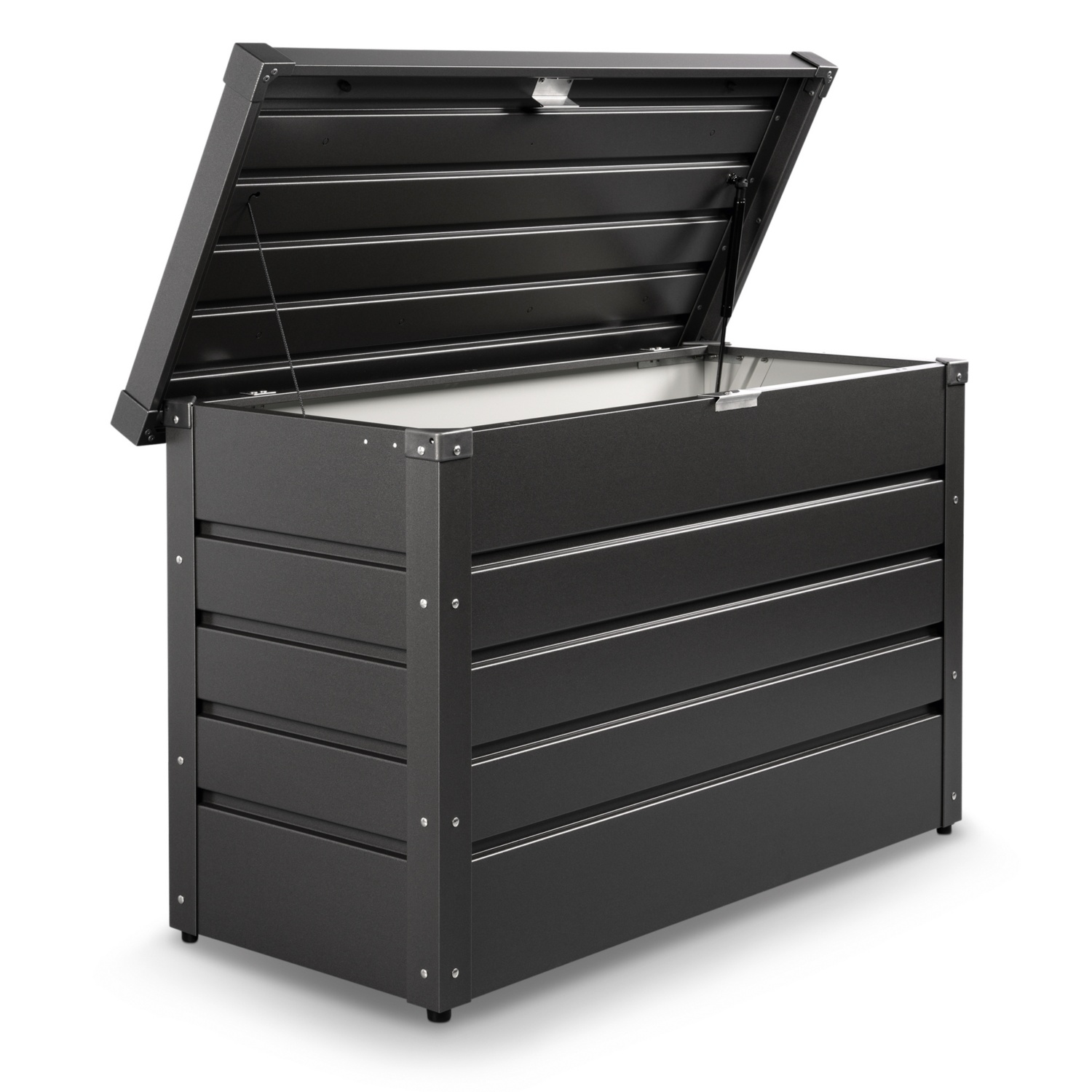 Die Premium Outdoorbox dient zur Aufbewahrung von Gartenauflagen und Polstern. Die Konstruktion ist für den dauerhaften Einsatz im Außenbereich ausgelegt und schützt den Inhalt vor Witterungseinflüssen.
