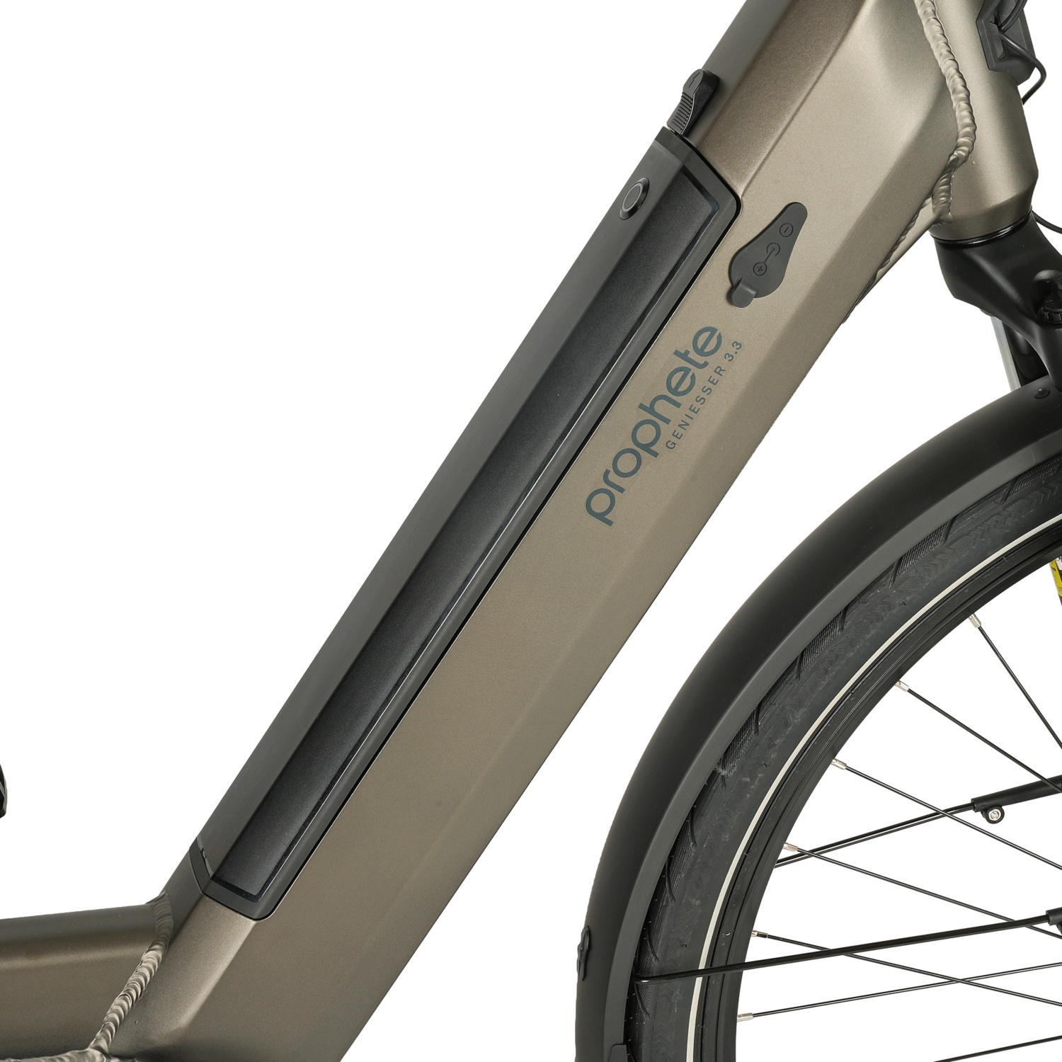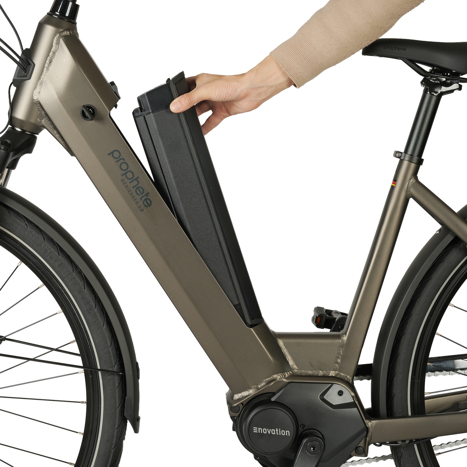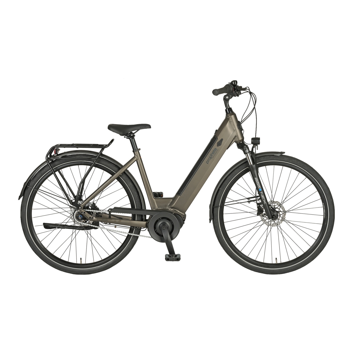 Prophete Geniesser 3.3 City E-Bike 28" mit Mittelmotor Bis 25 km/h Fahrunterstützung - Reichweite max. ca. 110 km Das Prophete Geniesser 3.3 ist ein Highlight in der Kategorie der City E-Bikes. Der Rahmen bietet Platz für ein vollständig im Rahmen integriertes Akkusystem. Der 36 Volt Li-Ionen Akku mit 10 Ah (360 Wh) hat genug Kapazitäten, um den enovation Mittelmotor für bis zu 110 km mit Energie zu versorgen (je nach Fahrweise und Beschaffenheit des Untergrundes). Die 250 Watt Leistung unterstützen Sie beim Treten kraftvoll, bei einem maximalen Drehmoment von 70 Nm. Ein Drehmomentsensor und der integrierte Freilauf sorgen für entspannte Dynamik beim Fahren. Am Komfort-Lenker mit geschraubten Ergogriffen steuern Sie die 5 Unterstützungsstufen bequem über das Bedienelement des übersichtlichen LCD-Displays. Hier werden Leistungsregelung und Restreichweite angezeigt und Sie können zusätzlich die Anschiebehilfe bedienen, die Ihr Prophete E-Bike auf 6 km/h Schrittgeschwindigkeit anfahren lässt. Auch das Beleuchtungssystem, mit einem 40 Lux Prophete Scheinwerfer und Rücklicht, schalten Sie hier ein und aus. Dank der Versorgung über den Akku bleiben Sie auch im Stand sichtbar für andere Verkehrsteilnehmer. Der Stromsparmodus schaltet das elektronische System automatisch aus, wenn Sie Ihr E-Bike für 5 Minuten nicht nutzen. Für Ihre Sicherheit wurde ein hydraulisches Bremssystem an Vorder- und Hinterrad verbaut, das Ihr E-Bike schnell und kraftvoll in den Stand bringt. Festen Stand bieten Ihnen auch die Anti-Rutsch-Pedale. Gemütliches Fahren ermöglichen die einstellbare Suntour NEX Federgabel aus Aluminium und die Shimano NEXUS 7-Gang Nabenschaltung, sowie ein bequemer City-Sattel und ein winkelverstellbarer Vorbau, zur Anpassung der Lenkerposition. Abgerundet wird das Ausstattungspaket mit den 28“ Kenda Kahn II Reifen mit Reflexstreifen. Die matt-bronzene Lackierung des Prophete Geniesser 3.3 City E-Bikes liegt voll im Trend und die robuste Optik des Wave-Rahmens mit 48 cm Rahmenhöhe, wird vom strebenlosen Heck-Gepäckträger HD 27kg (Kindersitz zugelassen) komplettiert. Natürlich ist das Modell nach den Vorgaben der StVZO ausgestattet und kommt mit Bedienungsanleitung und Ladegerät im Lieferumfang.