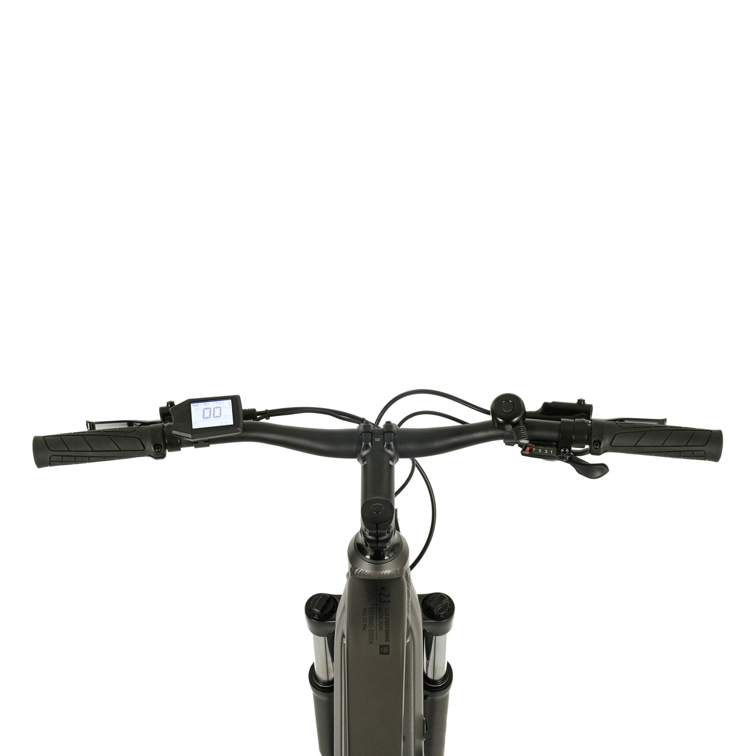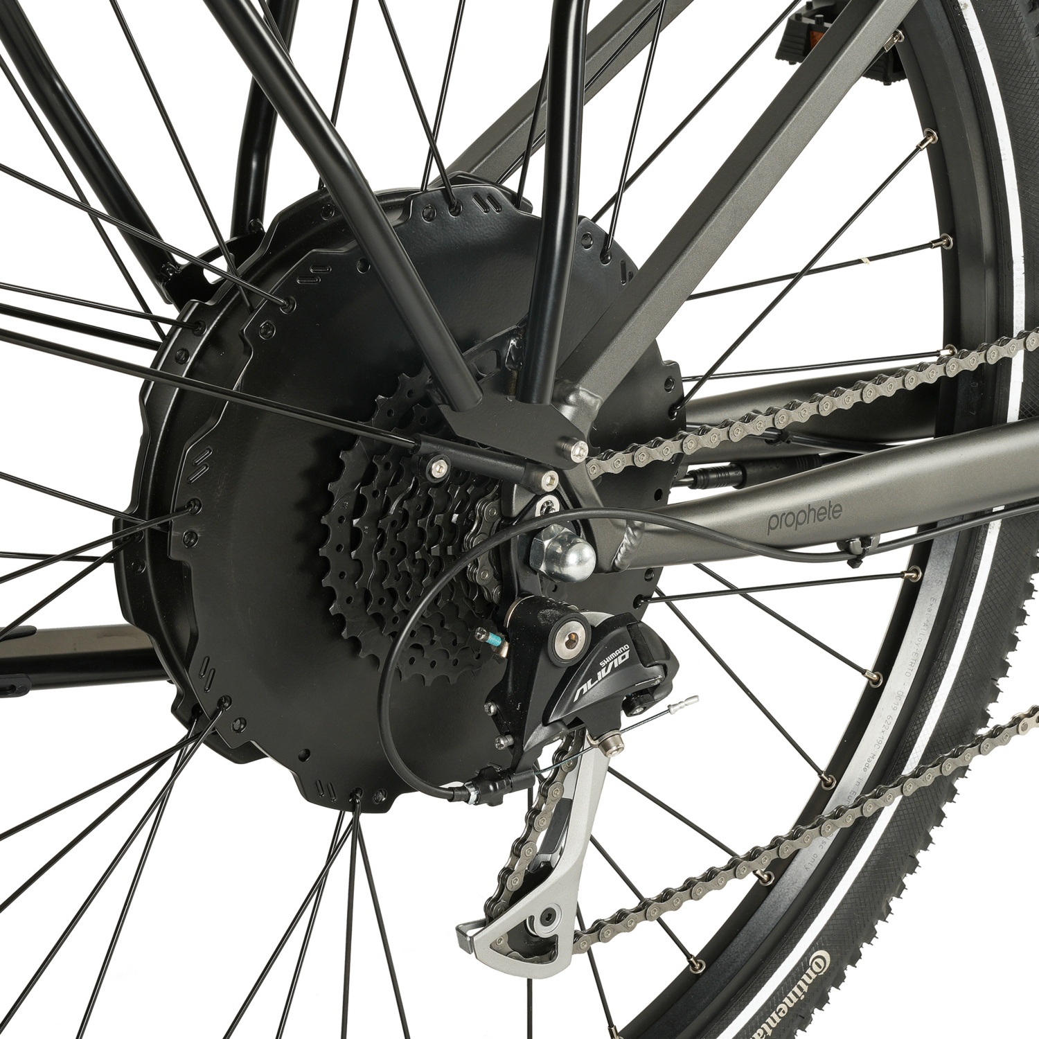 Das kleine Kraftpaket im Hinterrad bringt 250 Watt Leistung und ein maximales Drehmoment von 46 Nm mit. Verbunden mit dem 11,1Ah (520 Wh) Lithium-Ionen-Akku am Unterrohr, stehen Ihnen alle Wege offen. Dank des CAN-Bus Protokolls, mit dem alle elektronischen Elemente des Twentyniner E-Bikes verbunden sind, kommunizieren Motor, Controller, Akku und Display in Echtzeit miteinander. Auf dem LCD-Multifunktionsdisplay können Sie immer die aktuellen Informationen über das E-Bike System des Prophete Stack 2.3 ablesen. Die Anschiebehilfe und die Beleuchtung steuern Sie auch hier am Bedienelement des Displays. Der 120 LUX LED-Scheinwerfer und das Rücklicht bleiben auch im Stand an, da sie vom Akku mit Energie versorgt werden. Für bessere Sichtbarkeit im Straßenverkehr sorgen auch die Continental Double Fighter Reifen mit Reflexelementen und Pannenstopp.