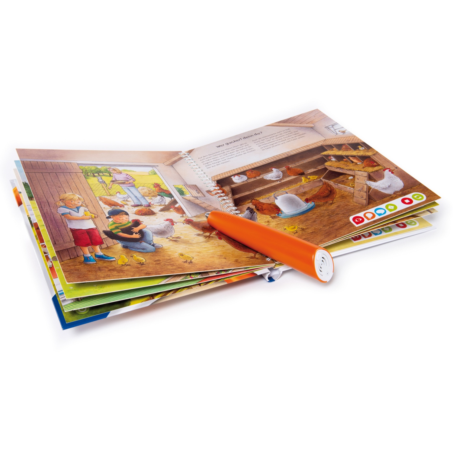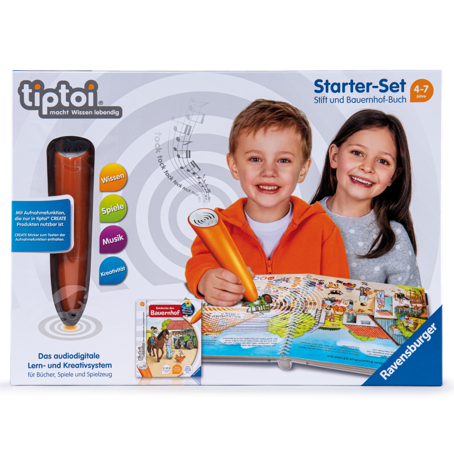 Der tiptoi® Stift macht Wissen lebendig. Einzigartige Qualität der Lerninhalte und des Spielerlebnisses durch verschiedene Erlebnisebenen. Lebensechte Geräusche und faszinierende Bilder vermitteln Grundwissen rund um den Bauernhof und laden zum Entdecken und Ausprobieren ein. Stift inkl. Aufnahmefunktion. Buch „Entdecke den Bauernhof“ inkl. Stift