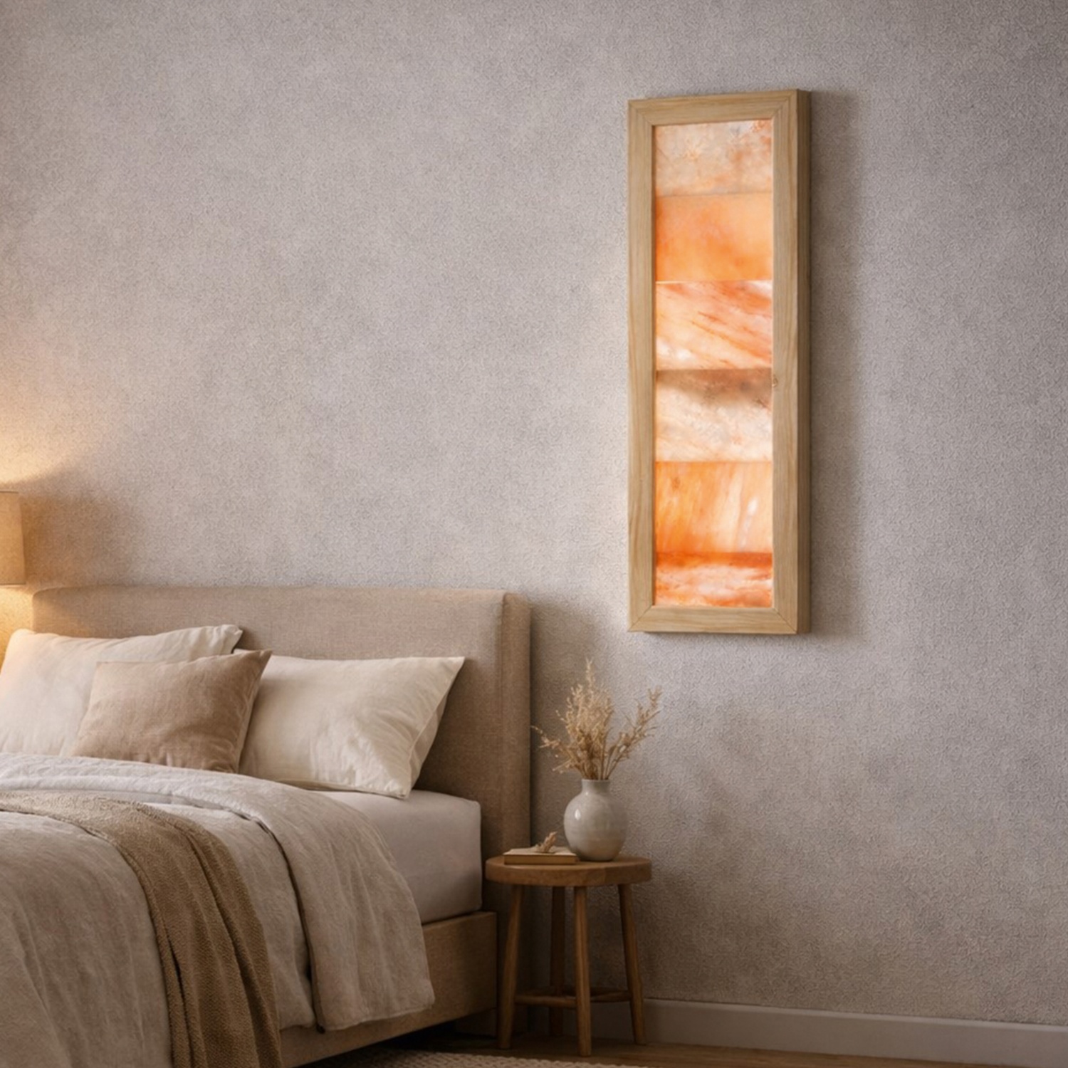 Der Fichtenholzrahmen vollendet das Design und macht die Salzwand zu einem stilvollen Highlight für Wohnräume, Büros, Praxen und Wellnessbereiche.