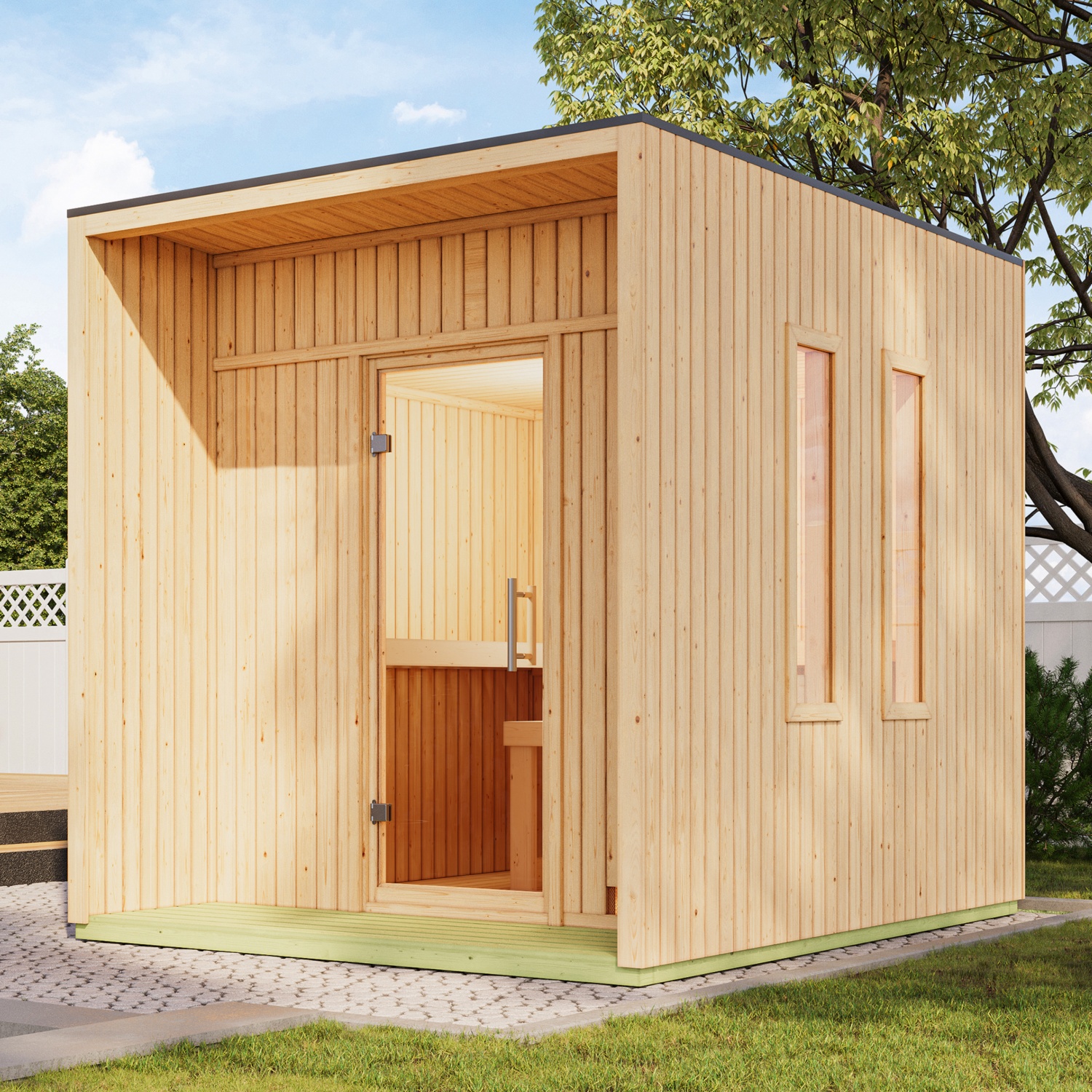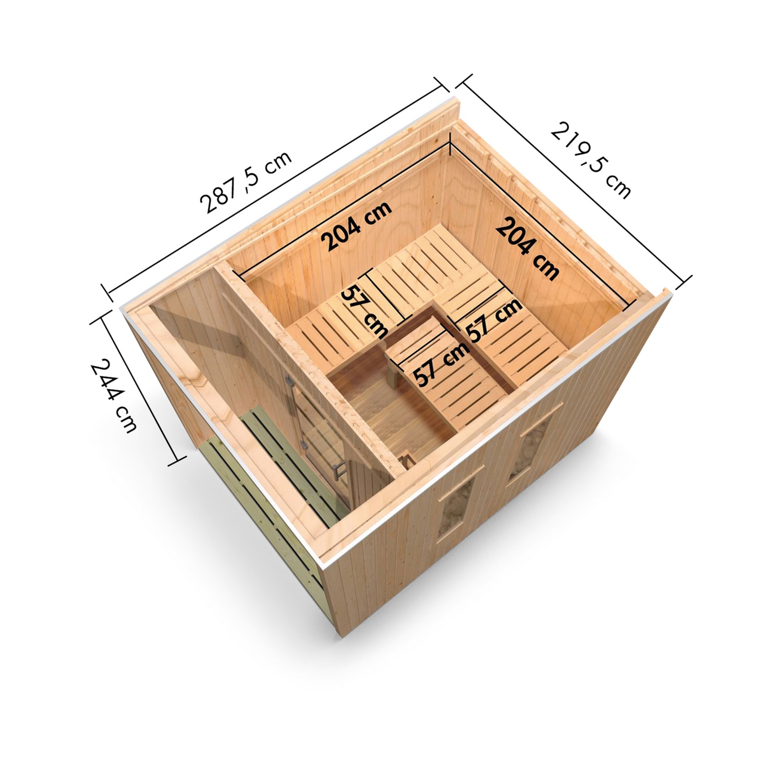 Mit ihren Außenmaßen von 219,5 cm x 287,5 cm und den daraus resultierenden Innenmaßen von 204 cm x 204 cm bietet unser Saunahaus für alle Anforderungen ausreichend Platz. Die Liegen werden innen auf Vierkanthölzern montiert, welche aufgrund der Systembauweise in der Höhe nicht flexibel sind. Ein Ofenschutzgitter ist stets im Lieferumfang enthalten. Nur für den privathäuslichen Einsatz geeignet.
