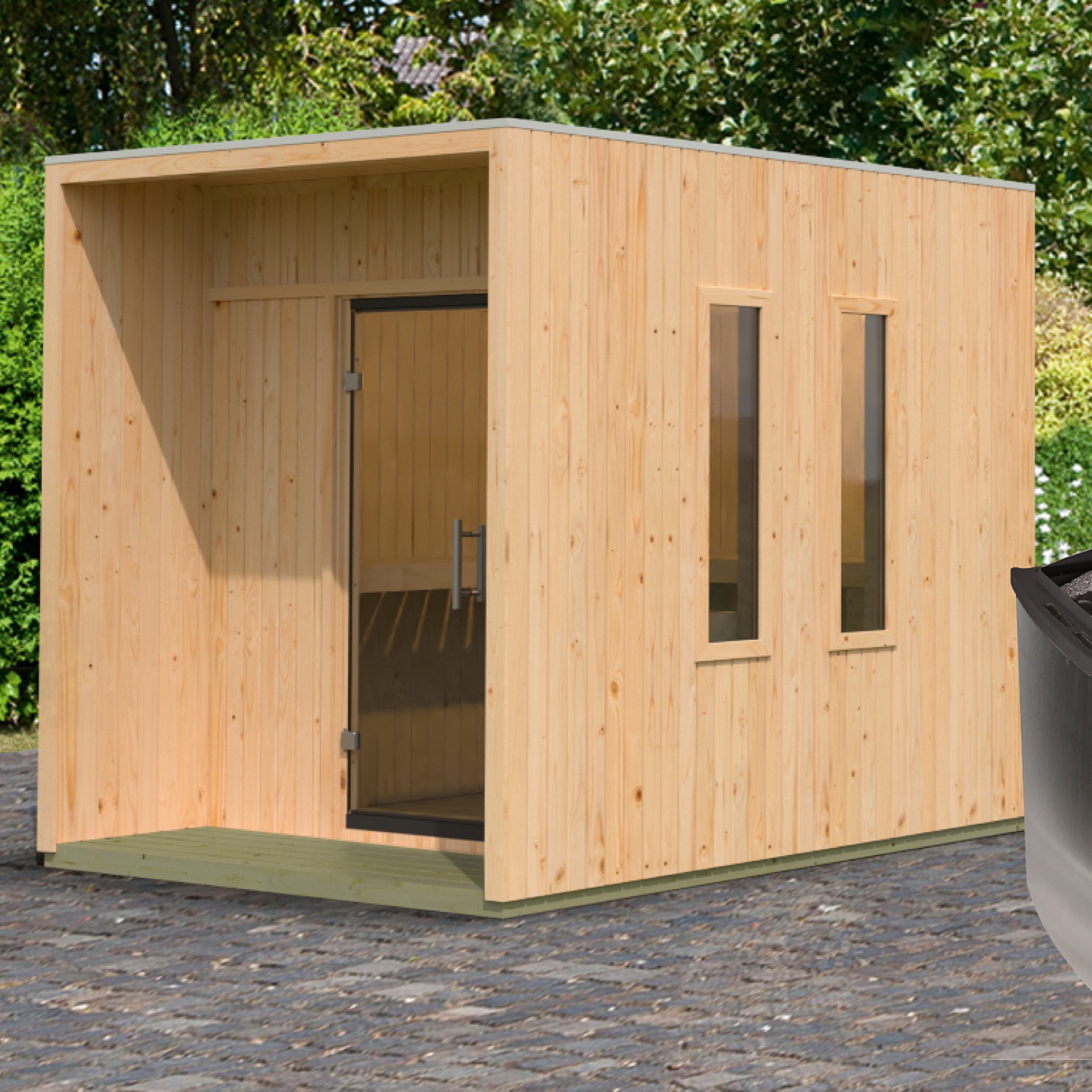 Das Saunahaus verfügt über einen formschönen und praktischen Fronteinstieg mit einer wärmegedämmten Energiespartür außen und einer bronzierten Ganzglastür im Innenbereich.