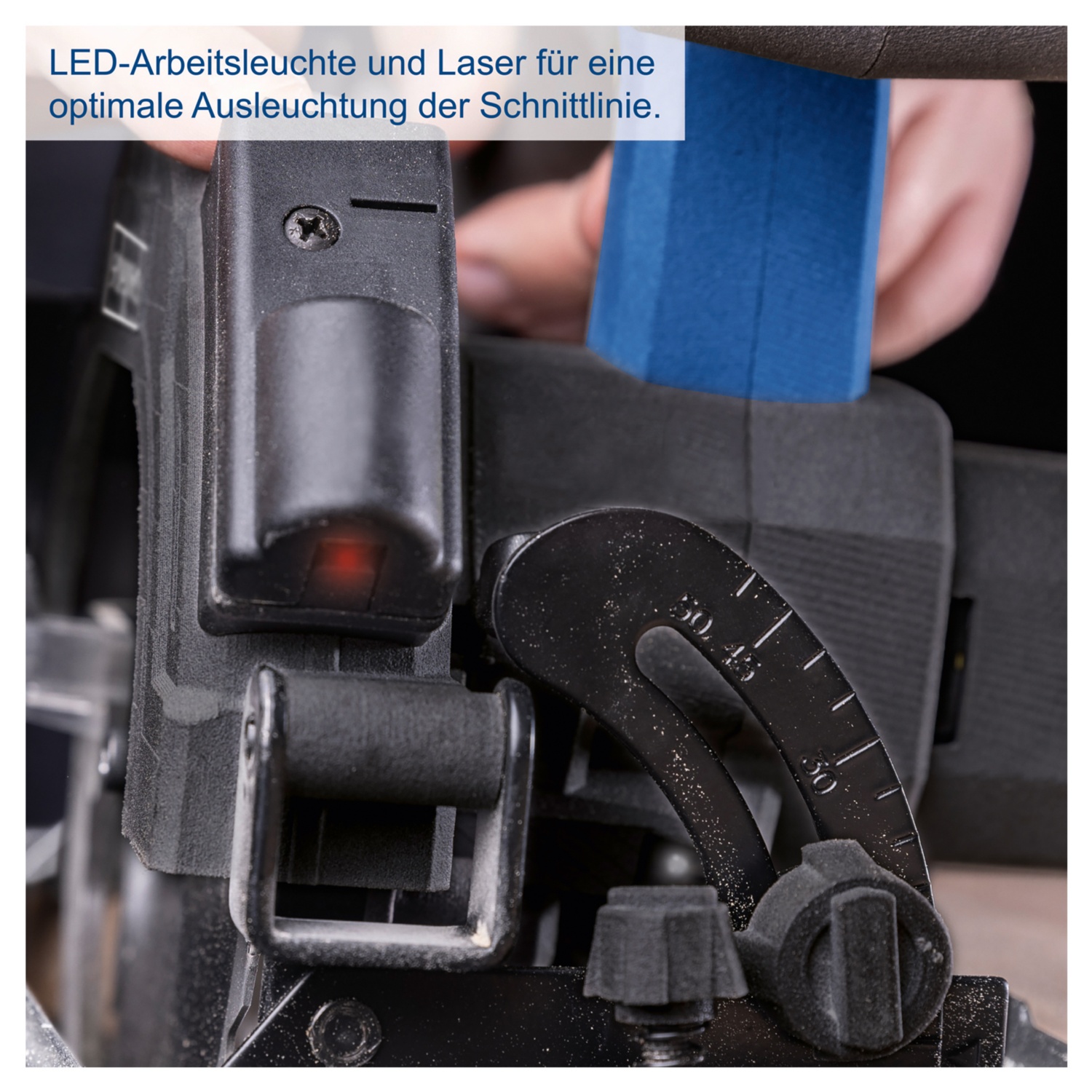 praktischer Laser und LED-Arbeitsleuchte sorgen für eine optimale Ausleuchtung der Schnittlinie