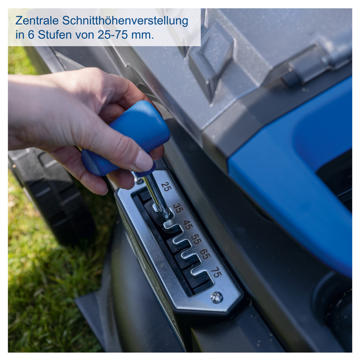 • zentrale Schnitthöhenverstellung in 6 Stufen von 25 – 75 mm