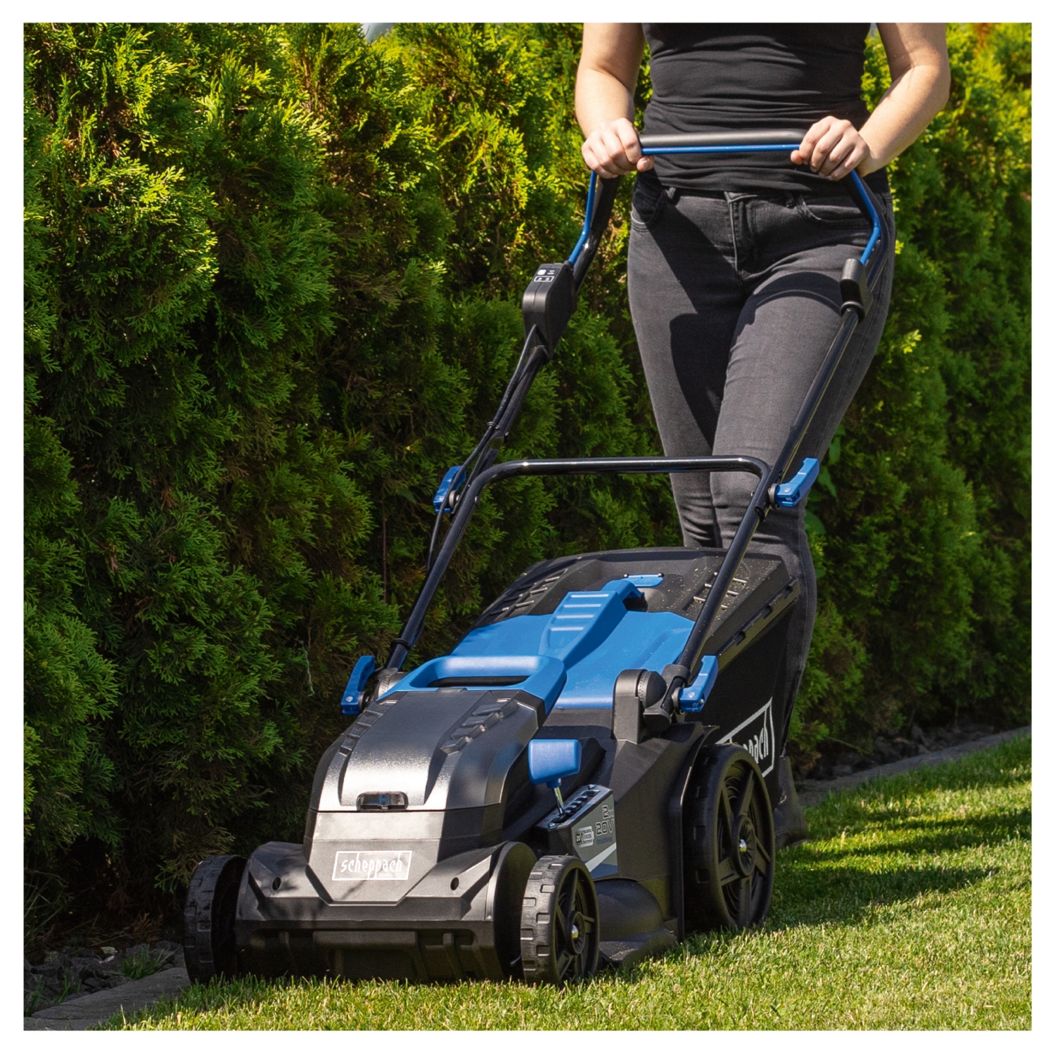 • kabelloses Arbeiten mit der Scheppach IXES 20-Volt-Serie – alle Akkus und Ladegeräte aus der Systemreihe können mit dem Akku-Rasenmäher kombiniert werden